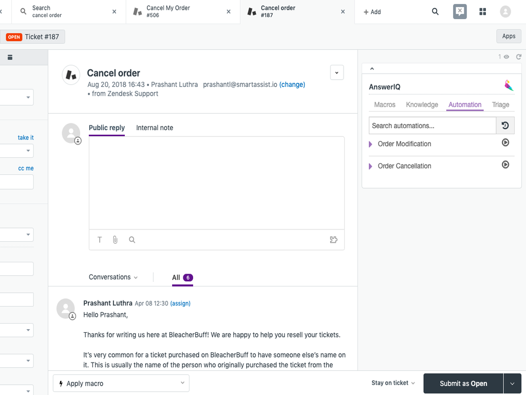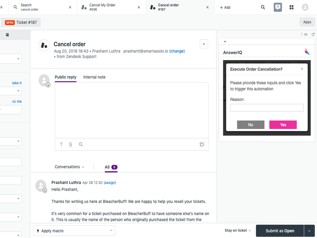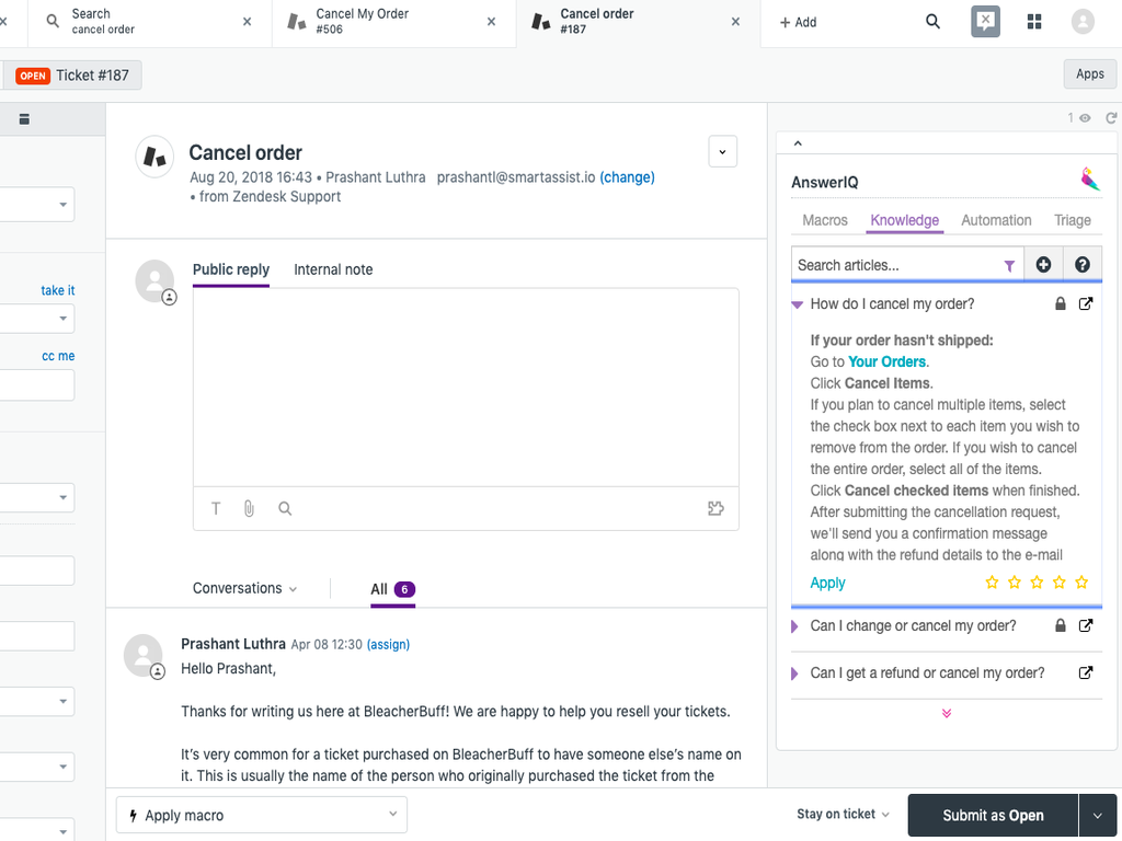 AnsweriQ app can be integrated to your Zendesk Support account in a single click and needs one time configuration. AnsweriQ’s sophisticated machine learning models train on your historical case data and create prediction models to suggest relevant articles, responses to agents and classification of cases and automations to run for the customer case. There is closed feedback loop that operates between the the agents actions and the AI models that continuously improves the accuracy of recommendations and keeps them up to date. Customers can access advanced real time product analytics dashboards to measure the performance of each product and continuously improve with AnsweriQ’s actionable insights to tune them. You can learn more about how it works here.