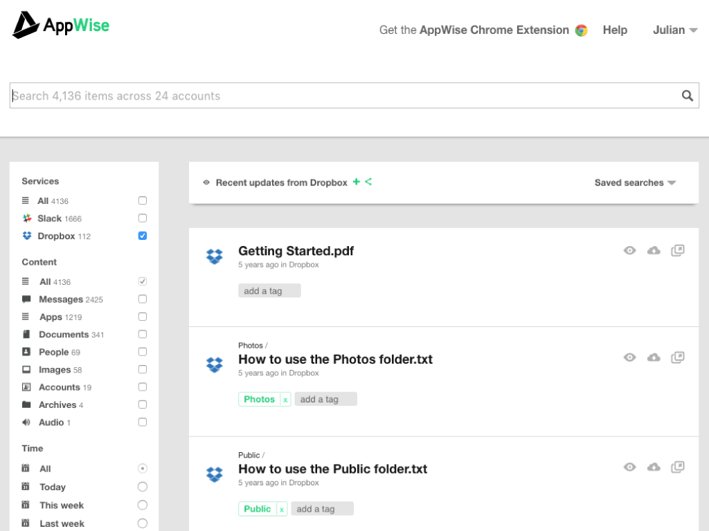 AppWise provides full, deep-text search with OCR across your Zendesk tickets and 40+ leading apps like Gmail, Google Drive, JIRA and Salesforce. Improve customer responsiveness by re-using knowledge from across your company with powerful search and filters to drill-down into specific apps, content types and refine by date ranges. Save your searches to streamline your workflow.