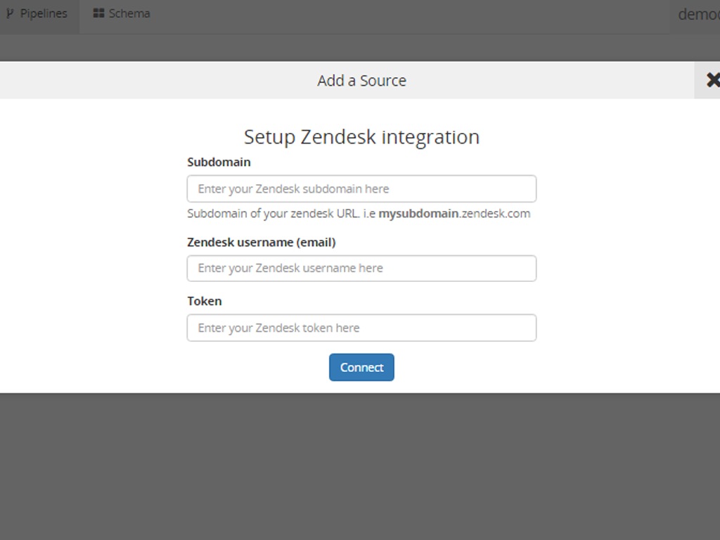 • Enter your Zendesk subdomain, your Zendesk Username, and API Token and click Connect
