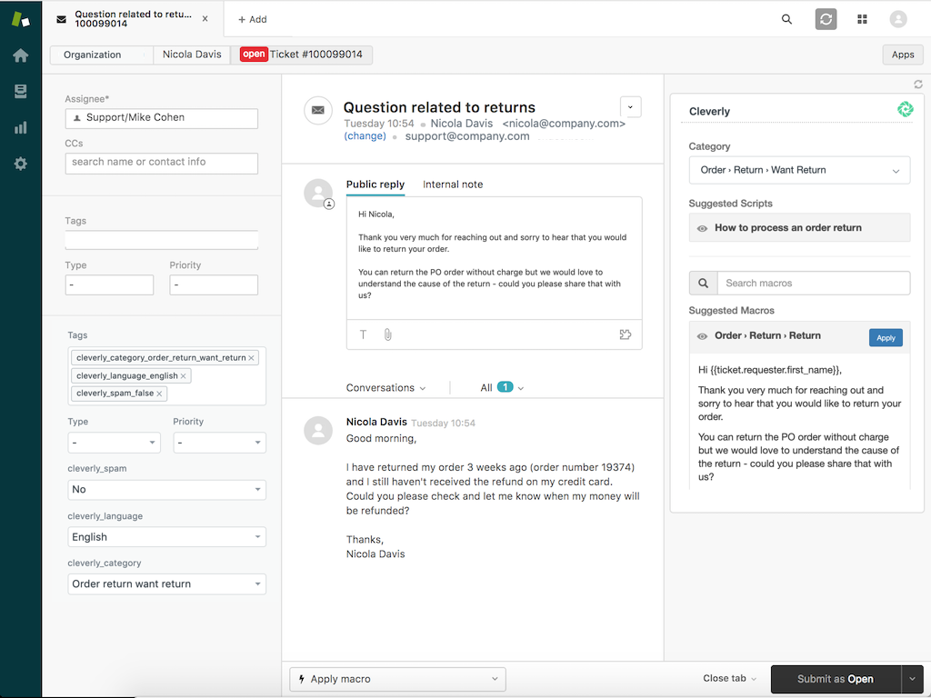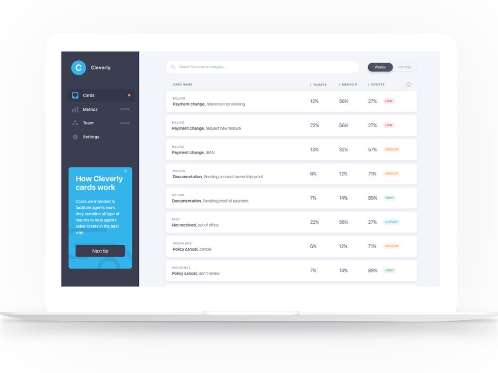 - Assist: Cleverly assists agents in finding the best way to deal with each customer request. It will provide guiding process scripts and answer suggestions for each ticket, which will speed up the resolution time. Moreover, the assistant can be tuned by the team manager to ensure that it provides contextual suggestions that are in line with the company's existing tone and standards. Not only is productivity increased significantly, but the ramp-up time of new agents is also 20% faster.
