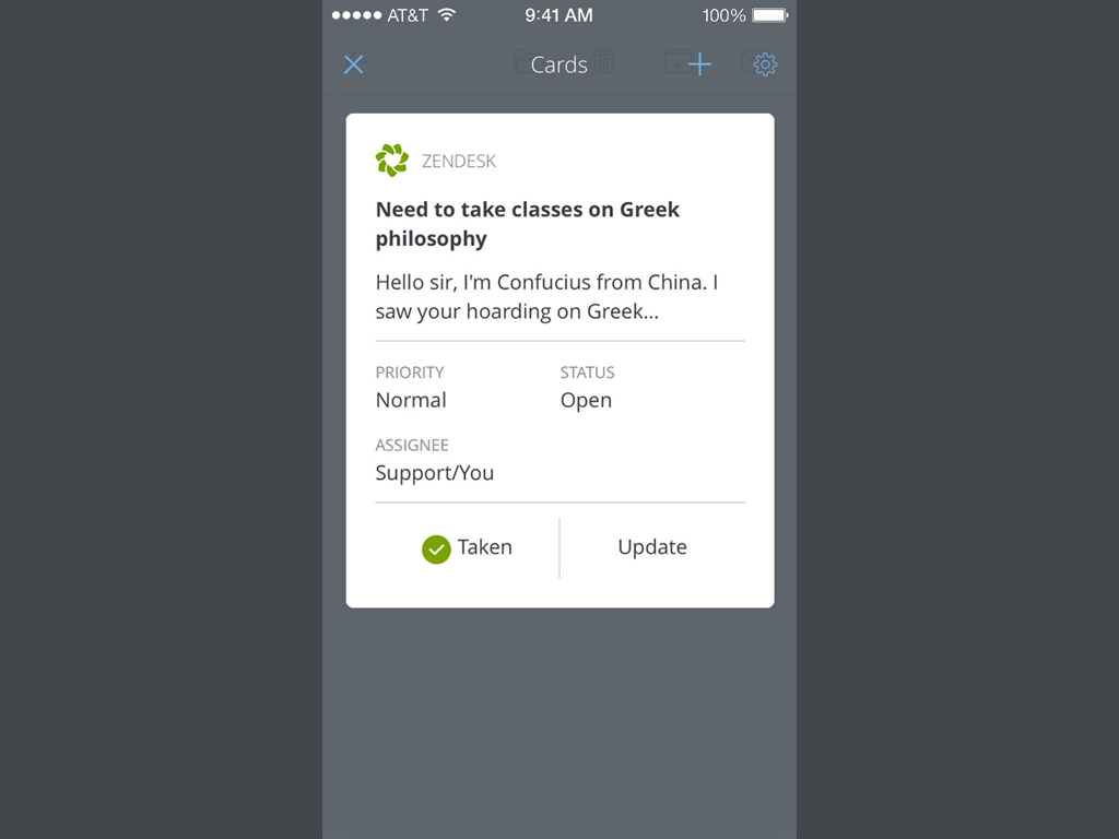 Double tap on any email to view Cards. You can add the Zendesk Card from the Card Gallery.Authenticate your Zendesk account and you're all set. The next time you receive an email, double tap on it to pull up the Zendesk Card to create a ticket with just a tap. Or, when you receive a Zendesk notification email, you can manage the ticket without leaving your email.