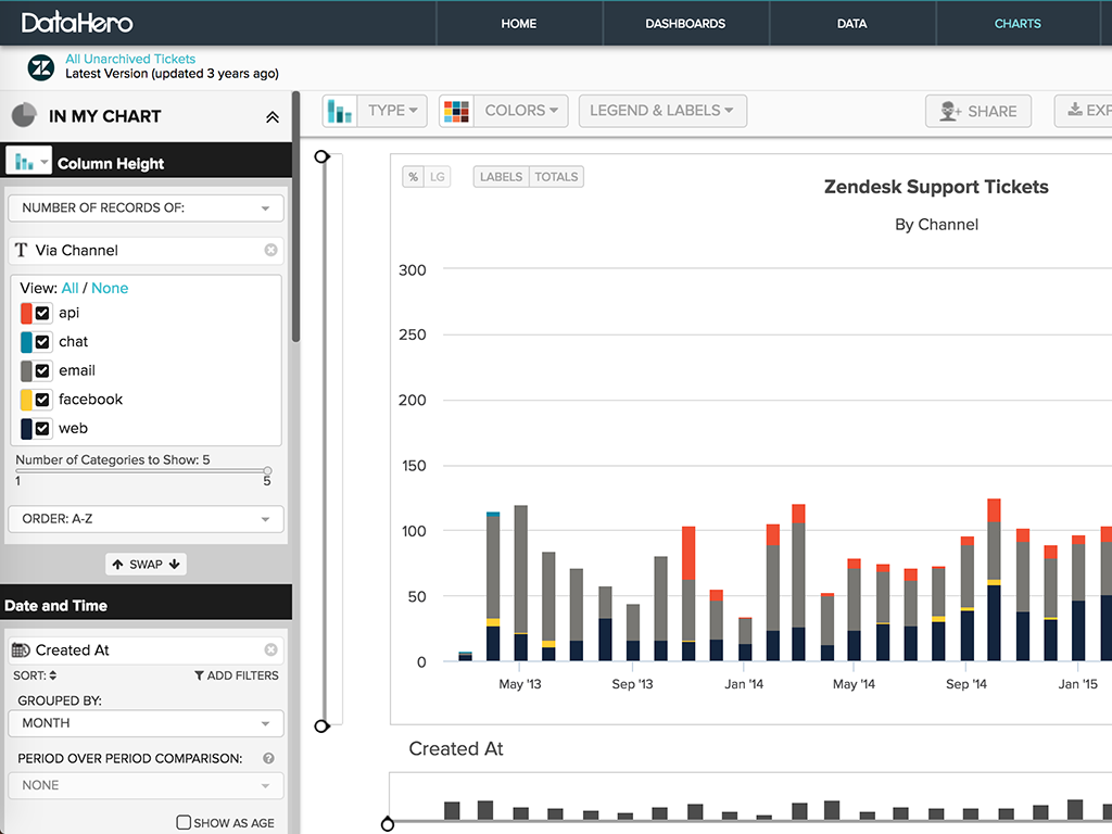 After connecting DataHero to Zendesk, you can easily create dynamic charts of your tickets by channel, time, or other attributes. Importing transactions takes just one click.