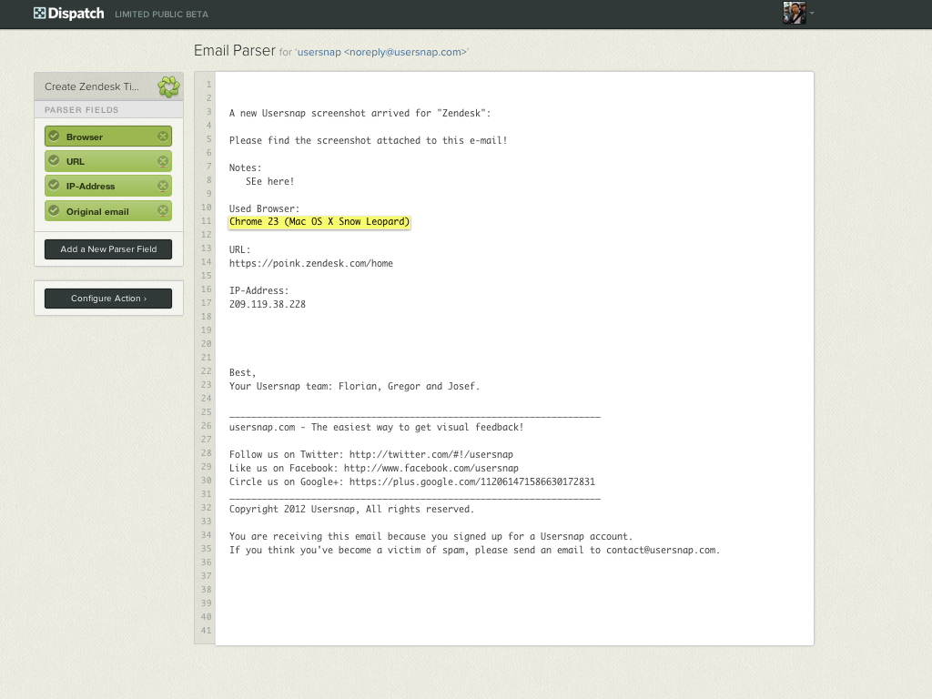 To use Dispatch with Zendesk, you'll first need to sign up for a Dispatch account. Next, you'll need to enable Token access in your Zendesk Settings. In Dispatch, simply complete your parser field setup and configure your Zendesk Action.