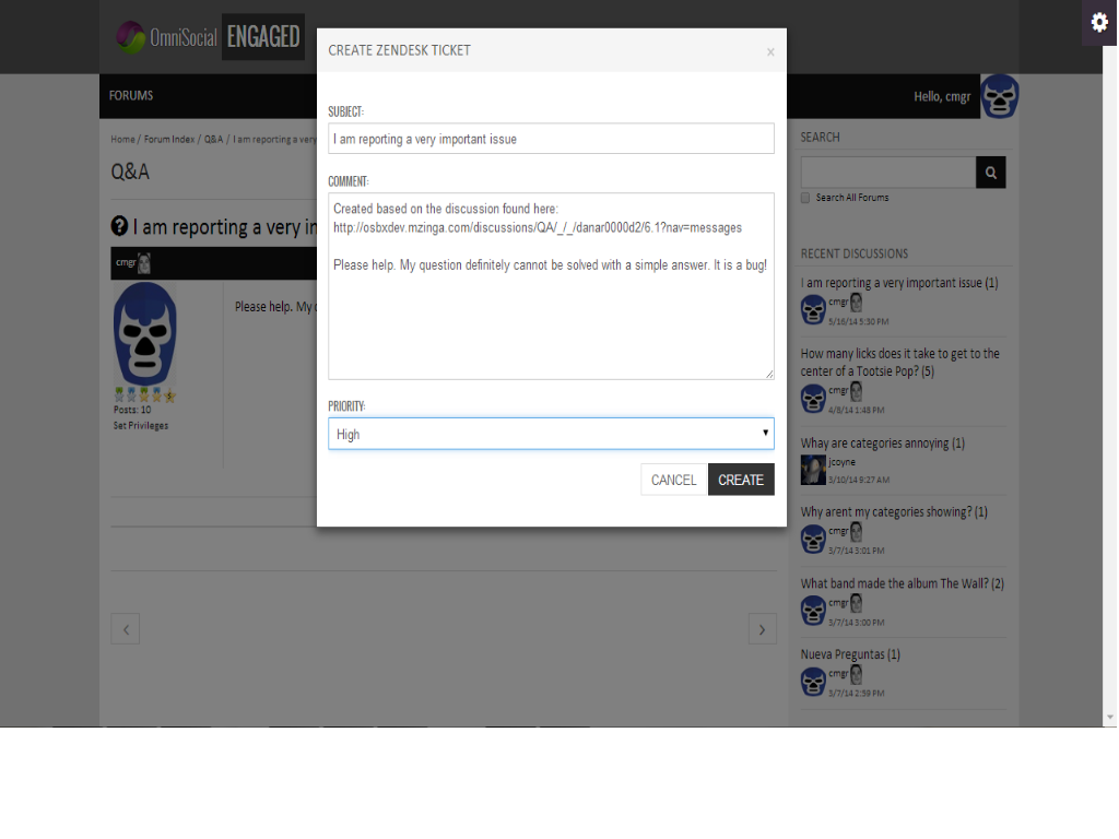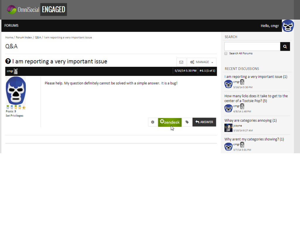 When users ask a question in your Customer Community that requires a helpdesk ticket to be created, the OmniSocial Engaged integration with Zendesk allows permissioned Admins and Community Managers to create, update, and prioritize tickets quickly and easily.