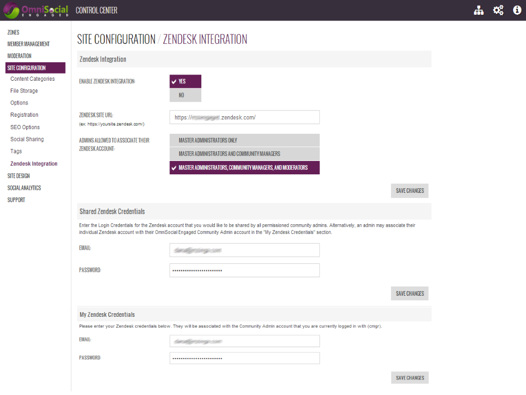 In the OmniSocial Engaged Control Center as a permissioned Admin, go to Site Configuration > Zendesk Integration. From here, you can turn on your Zendesk integration, enter your Zendesk URL and permission. You can link your Community Admin account with your Zendesk permissions or you can grant a whole tier of community admins access to a shared Zendesk account. Permissioned users will then see the (submit to) Zendesk button on all messages within the community.
