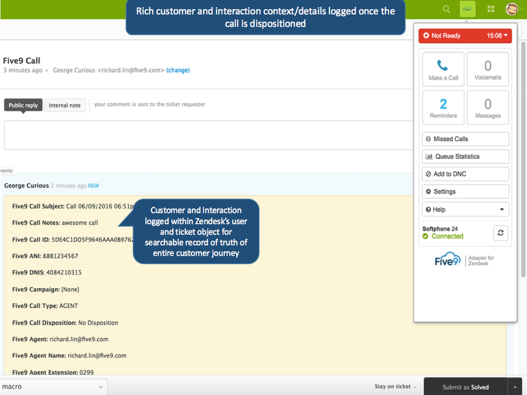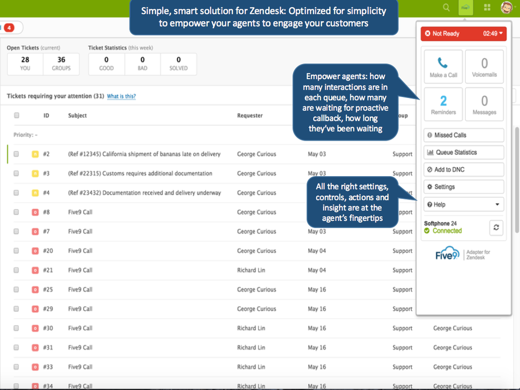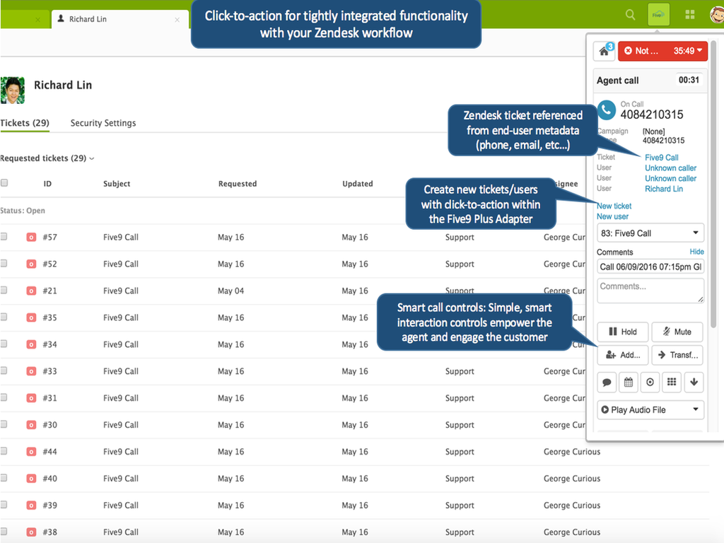 * Seamlessly integrated into Zendesk, Five9 provides agents with powerful-yet-intuitive call controls for inbound, outbound, and blended calls & campaigns directly from their familiar Zendesk application