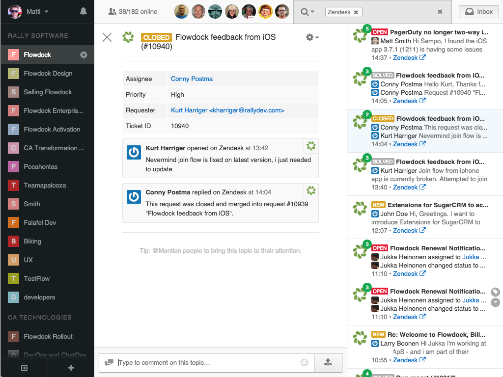Integrating your Zendesk into Flowdock, your support team will be able to quickly discuss and resolve issues. You can even perform basic actions such as closing or assigning tickets to yourself right from within Flowdock. See it in action.