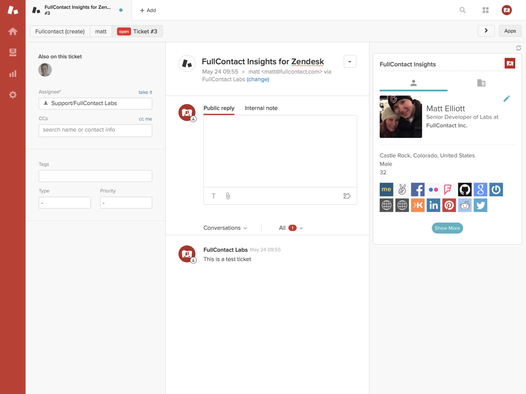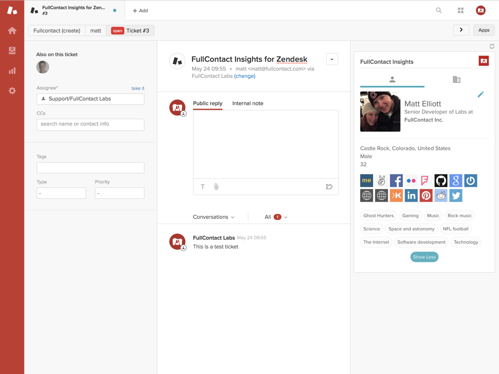 Gain 360-degree insights about the people that submit tickets to your organization with FullContact Insights for Zendesk. The app displays in the Zendesk ticket sidebar, providing quick and easy access to personal and company information about the ticket's requester. Utilize these insights to enhance context and build personalized responses that improve engagement with your audience. With FullContact Insights for Zendesk you will be able to: