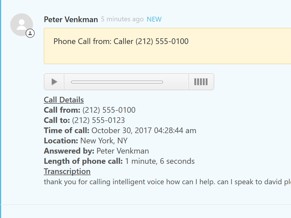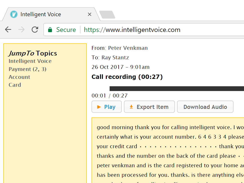 - Intelligent Voice detects and redacts credit card information in both the audio file and the transcript.
