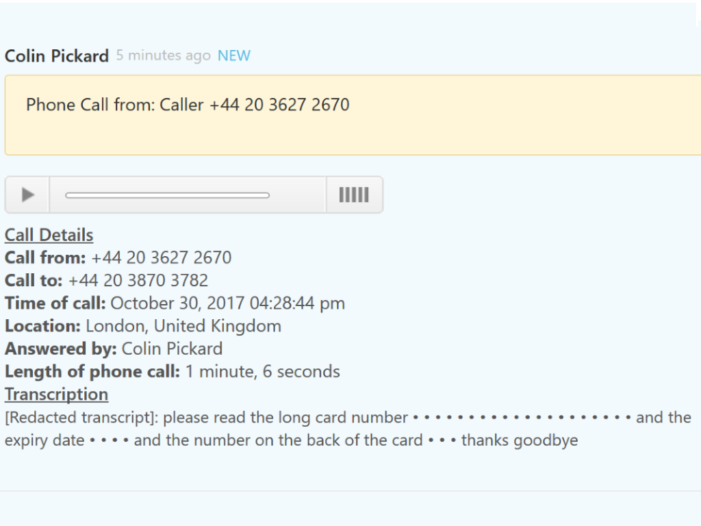 Your recorded calls in Zendesk Talk transcribed by Intelligent Voice, with smart redaction of payment card data so your organisation can be compliant with PCI DSS.