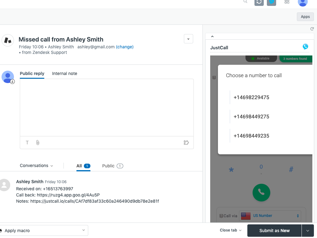 6. Log Calls under the same ticket Unlike other phone systems, we do not create new tickets on Zendesk unnecessarily. Your calls are logged back under the same ticket from where they originated.