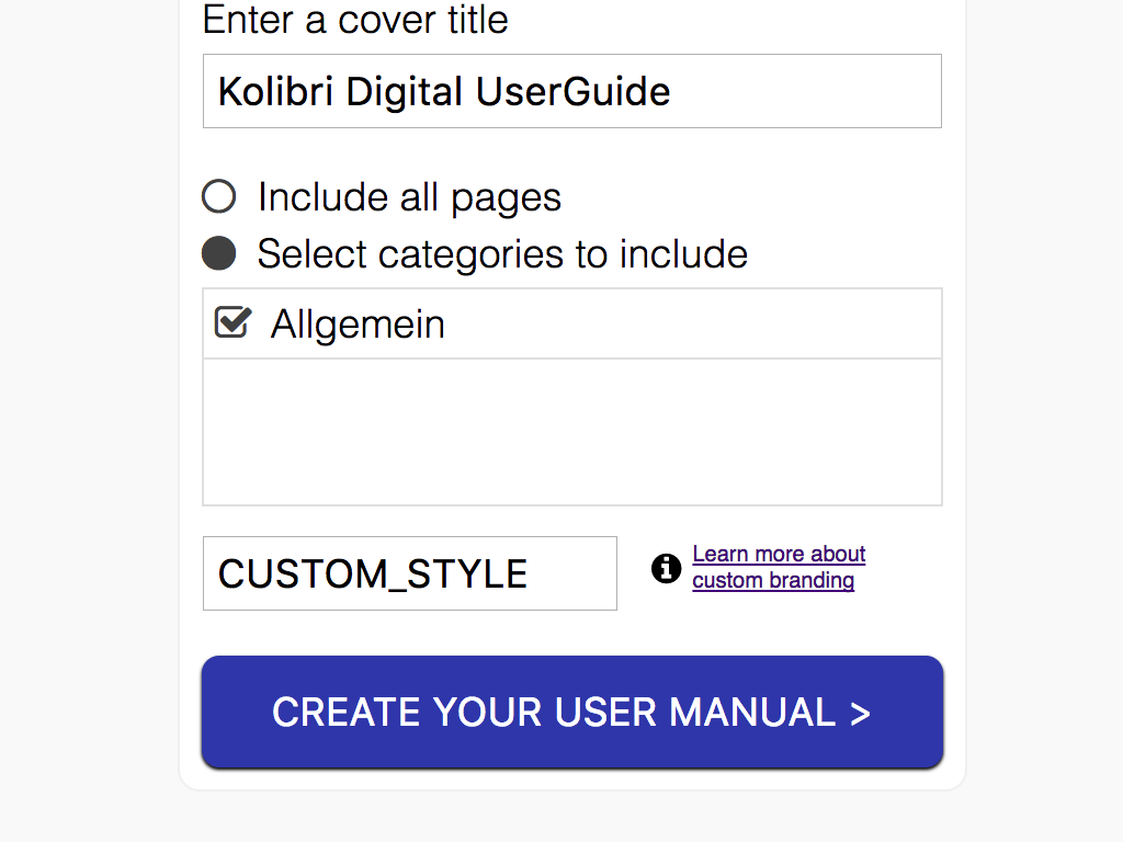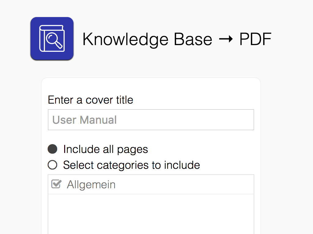 Set a cover title, choose which articles or categories to include, generate your PDF, and you're ready to distribute your user manual to your favorite customers.