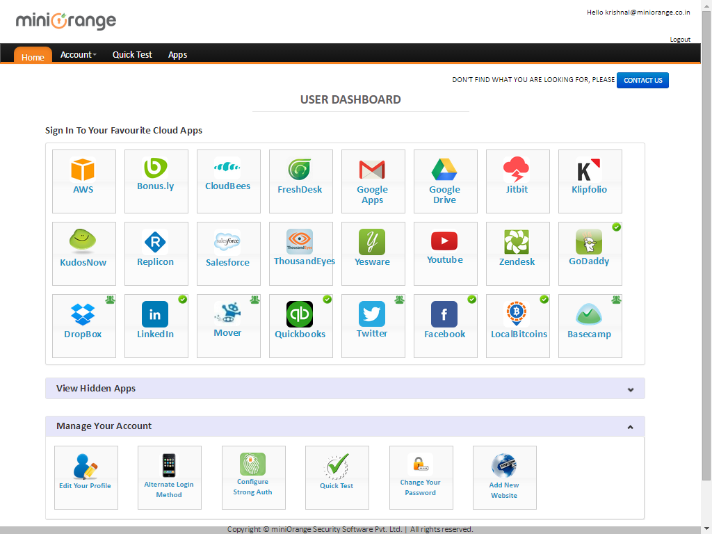 miniOrange Single Sign-on solution ensures seamless access to all enterprise resources, Once Authenticated with miniOrange SSO, users can easily connect and navigate within enterprise as per defined policies. miniOrange SSO Solution can be deployed in minutes and supports various Cloud Apps, Web Apps and Legacy Apps and is so easy to use that once logged in users do not need to authenticate separately to other applications.