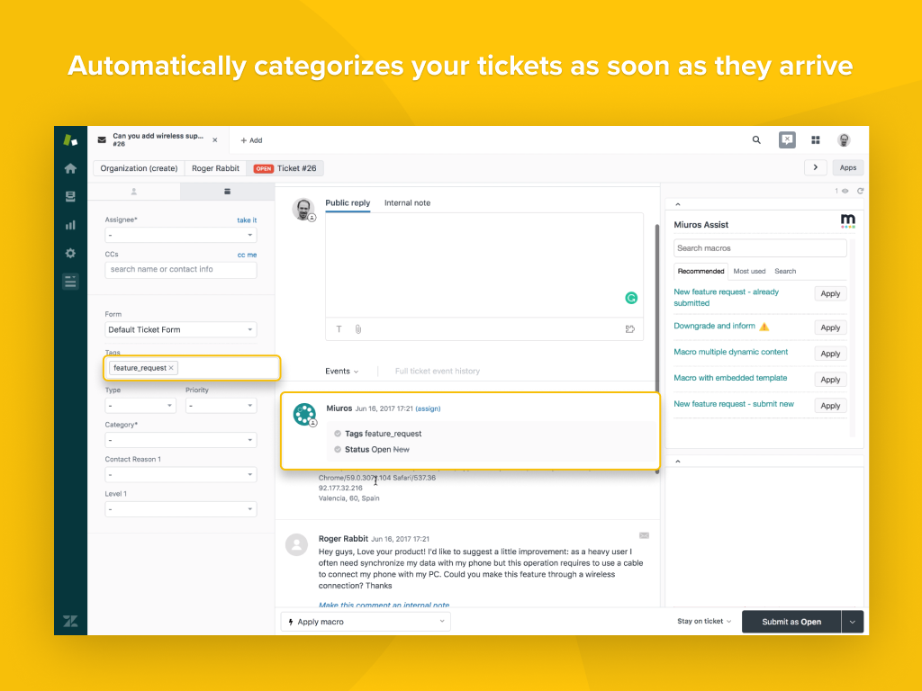 We use Natural Language Processing to scan the content of each ticket and recommend the macros that best match each specific request. Can’t find the right macro in the list of recommendations? Assist learns from your actions and improves recommendations over time.