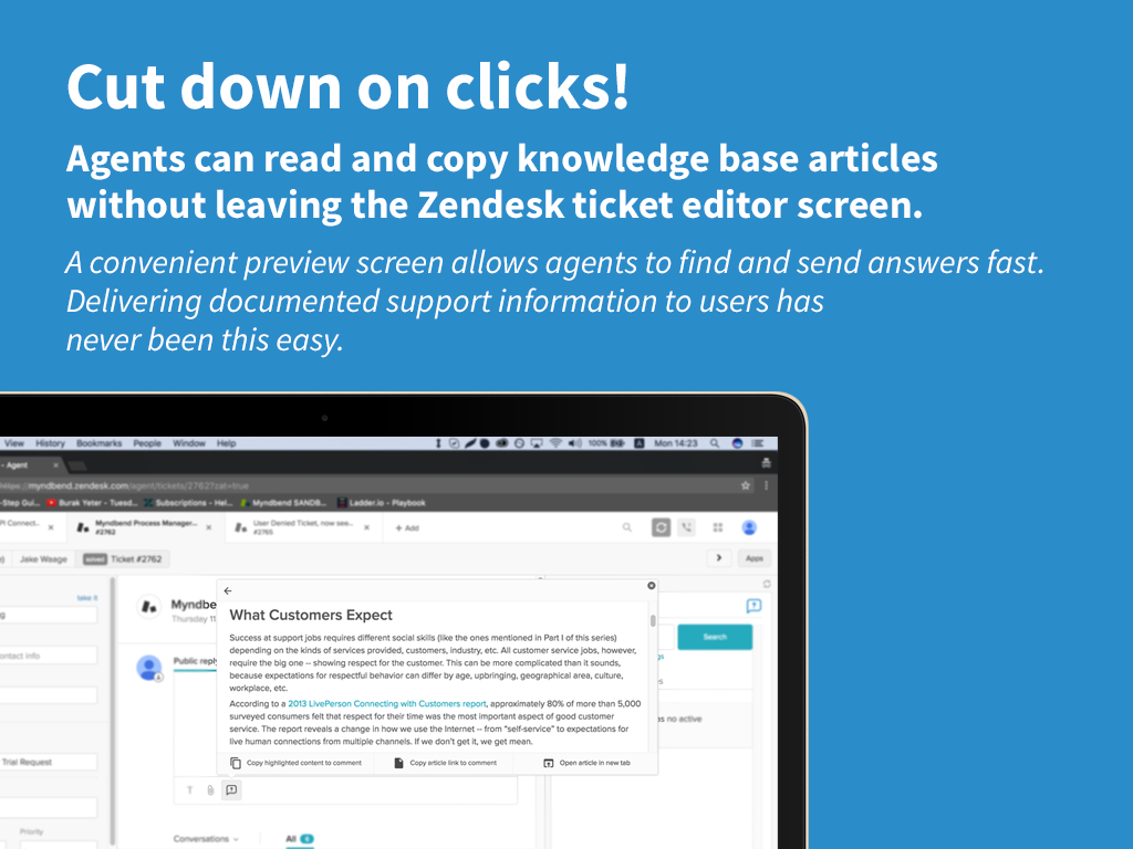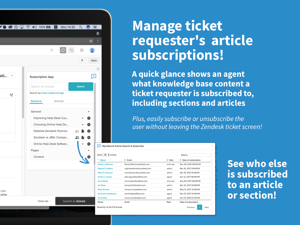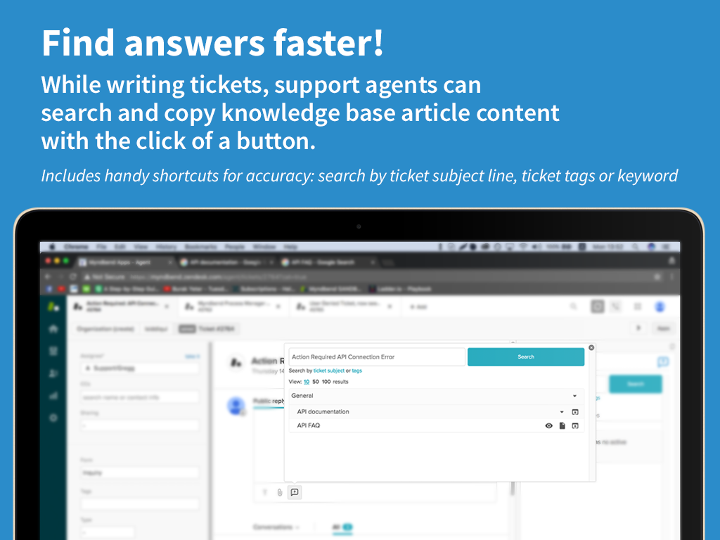 Myndbend Article Search & Subscribe™ makes it easy for agents to quickly look up knowledge base answers and copy them into the ticket editor, and manage which articles a user subscribes to, without leaving the ticket editing screen! Includes handy shortcuts for accuracy: search by ticket subject line, ticket tags or keyword. Try it now and see how delivering documented support information to your customers has never been so easy!