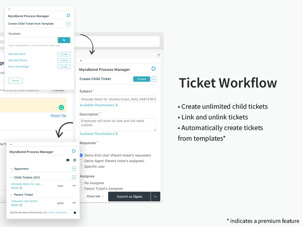 - Create child tickets (aka linked tickets or sub-tasks) from requests (parent tickets)