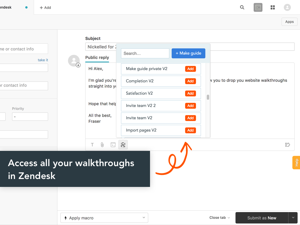 With our Zendesk app you can grab and share your website walkthroughs from right inside the Zendesk support application. Instead of explaining to people how to use your website, show them with a Nickelled website walkthrough.