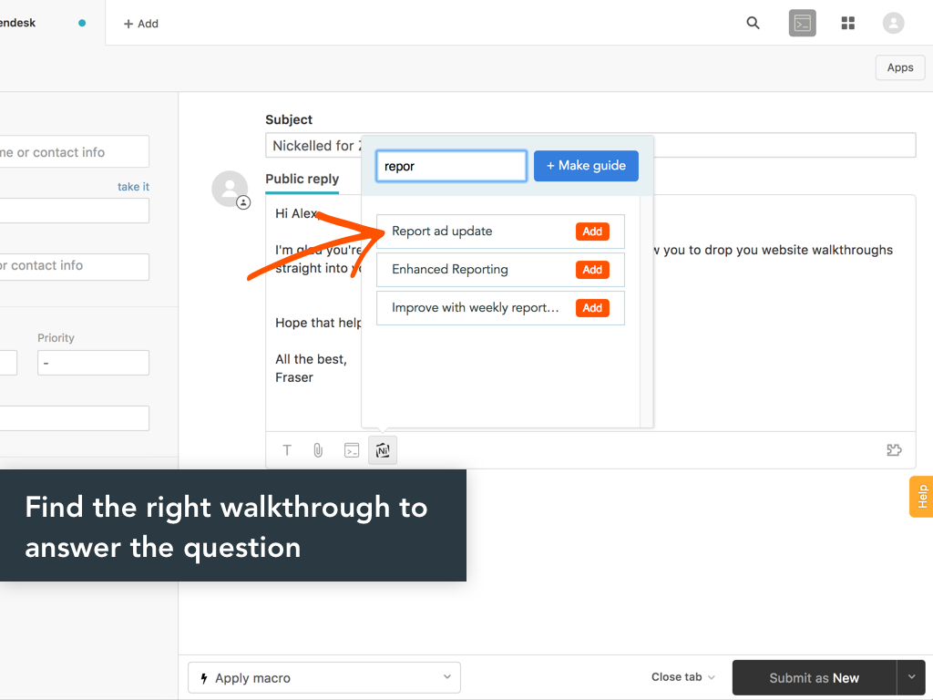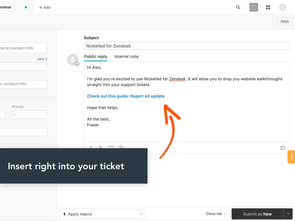 - Once installed, you'll see the Nickelled icon in the toolbox below the ticket editor. Click the icon to add your guides to any support ticket.