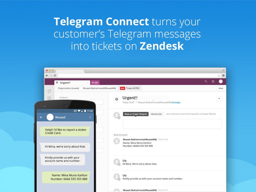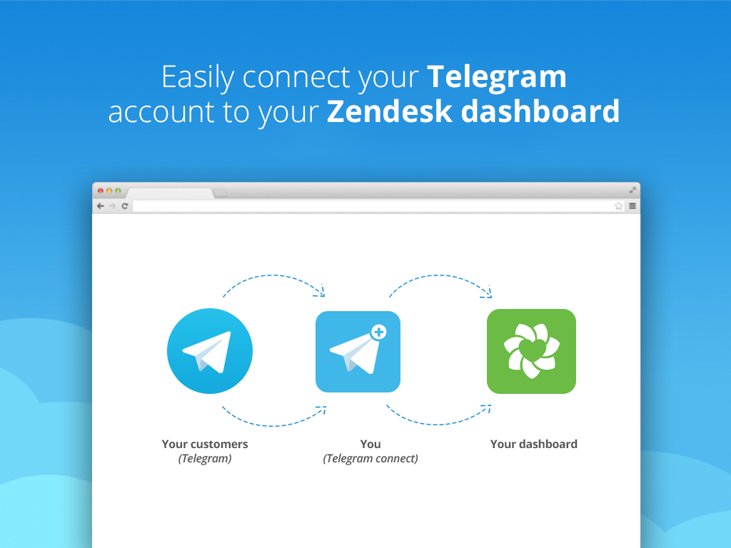 Telegram connect for Zendesk allows you to seamlessly integrate Telegram messages into your Zendesk work flow. In addition to Email and other traditional channels you can now easily reach your customers on Telegram without leaving Zendesk.More and more of your customers are spending time on Telegram and other Instant Messaging apps like Facebook Messenger, it’s time your company joined that conversation. With this App you will be able to do just that from the place where you already handle most of your support conversations … your Zendesk Dashboard.How does it work ? Telegram connect converts your Telegram®️ conversations into tickets on Zendesk and lets you manage them just as you would normal tickets from other channels.