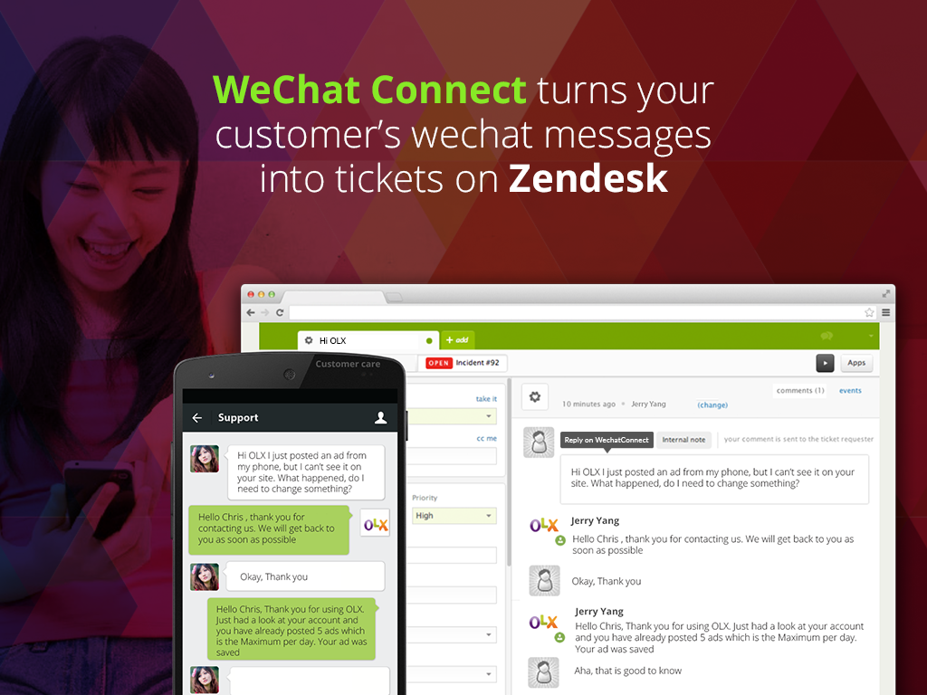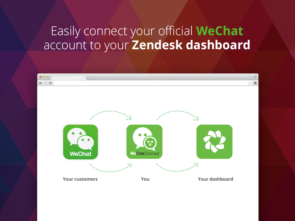 WeChat connect for Zendesk allows you to seamlessly integrate WeChat®️ messages into your Zendesk work flow. In addition to Email and other traditional channels you can now easily reach your customers on Wechat without leaving Zendesk. More and more of your customers are spending time on Wechat and other Instant Messaging apps like Facebook Messenger, it’s time your company joined that conversation. With this App you will be able to do just that from the place where you already handle most of your support conversations … your Zendesk Dashboard.How does it work ? Wechat connect converts your WeChat®️ conversations into tickets on Zendesk and lets you manage them just as you would normal tickets from other channels. For more details visit www.ongair.im or email us at hello@ongair.im