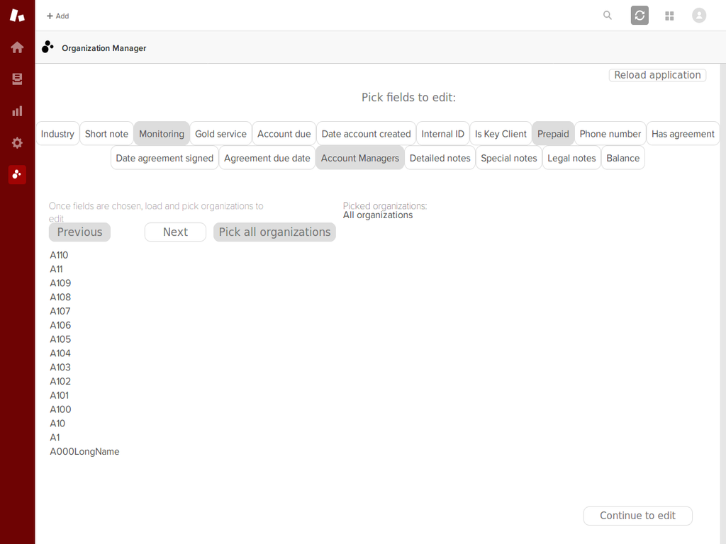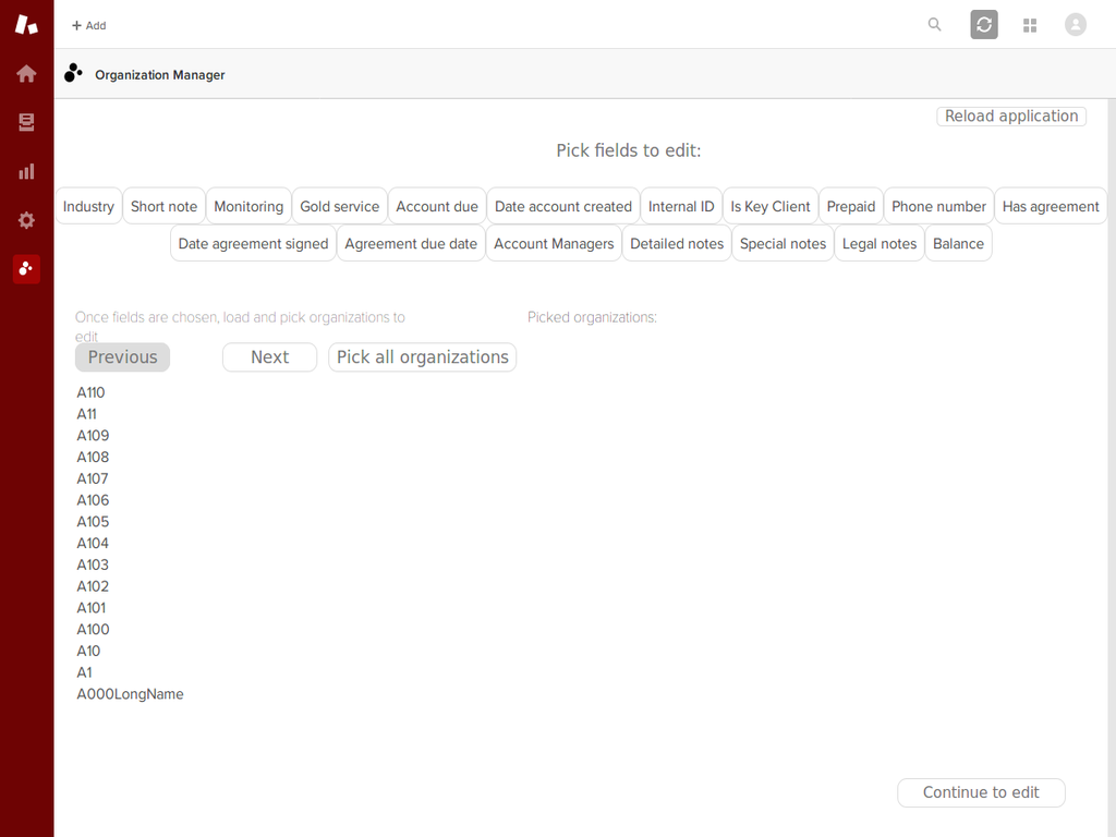 Select fields to update, pick organizations, enter values - update! It's that simple! *Source code available at https://github.com/Tribux/Organization-Manager