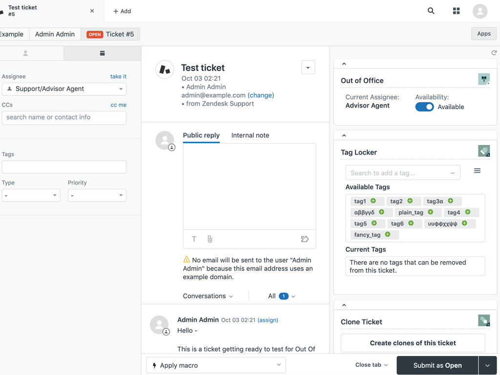 - These all work together in the background in conjunction with the Out of Office app. The user field adds/removes a tag "agent_ooo" to tickets in the background based on whether or not the user field is checked/unchecked.
