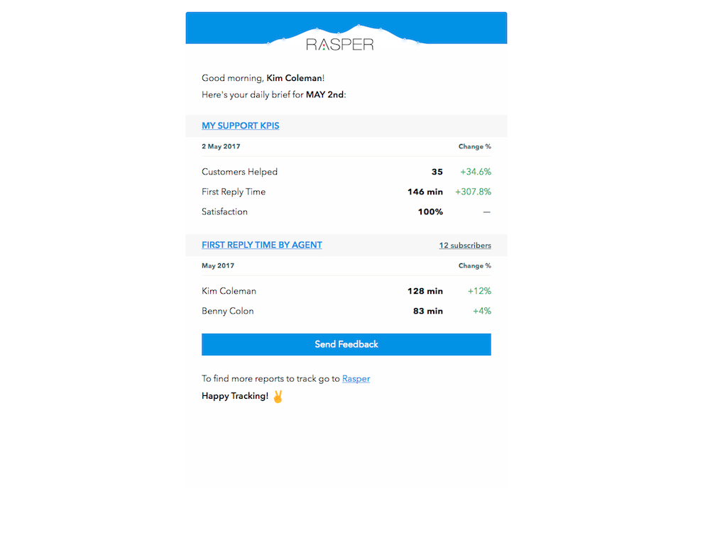 - Every morning receive a daily brief with support-related metrics and reports. We keep our reports short and mobile friendly. Ideal companion for a morning cup of coffee.