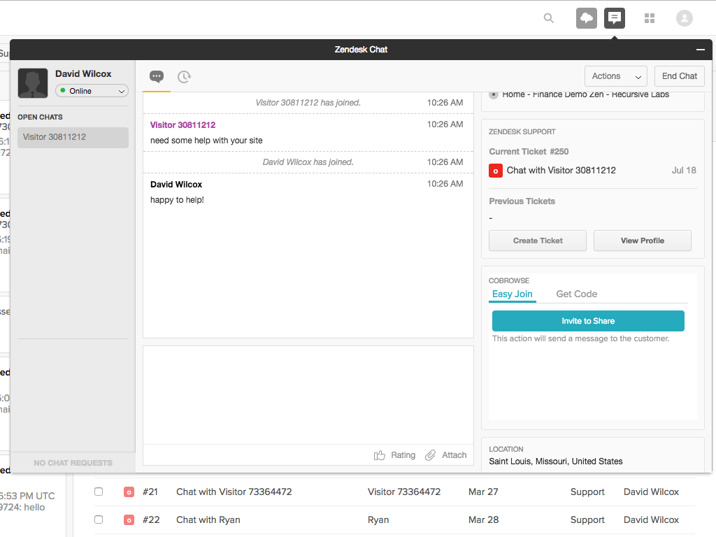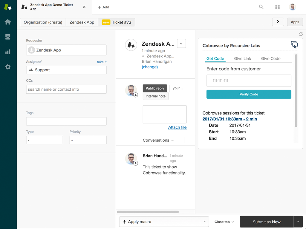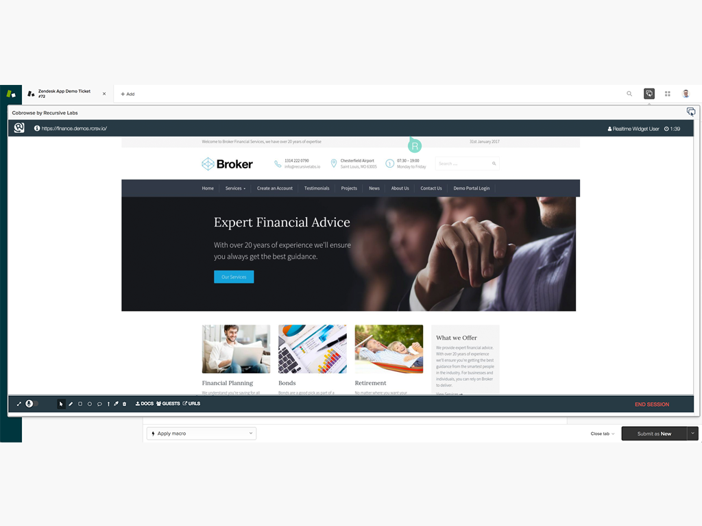 The Recursive Labs Zendesk integration brings these platform features to your agents: - Escalate to cobrowse from Zendesk chat or support with a single click. - Cobrowse with customers directly inside Zendesk; no new tabs or windows. - Automatically attach cobrowsing data to your trouble tickets for reporting/auditing purposes. - Turnkey integration with your existing Zendesk Web Widget.