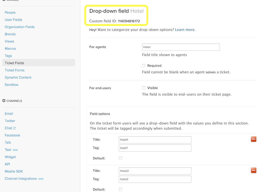 Get custom_field id you want to use as reference from Settings -> Ticket Fields and introduce it at app configuration form. You can also use the word 'requester' as 'id' if you want to get tickets submitted by the same person.