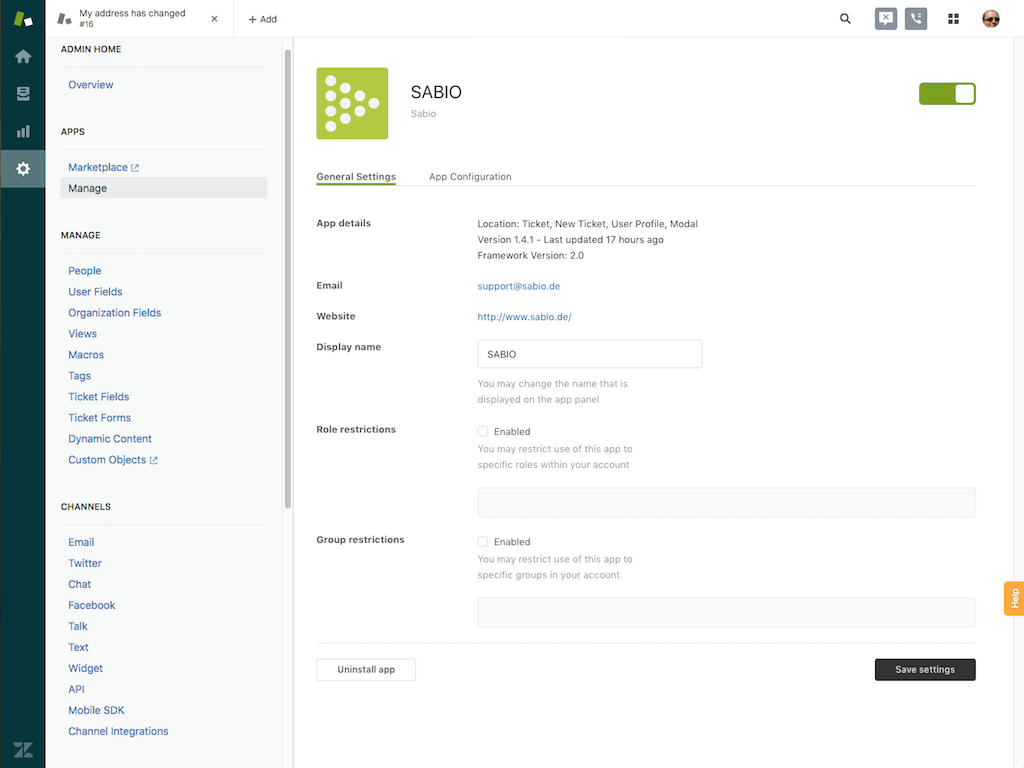 Install the SABIO App from the Zendesk App Marketplace