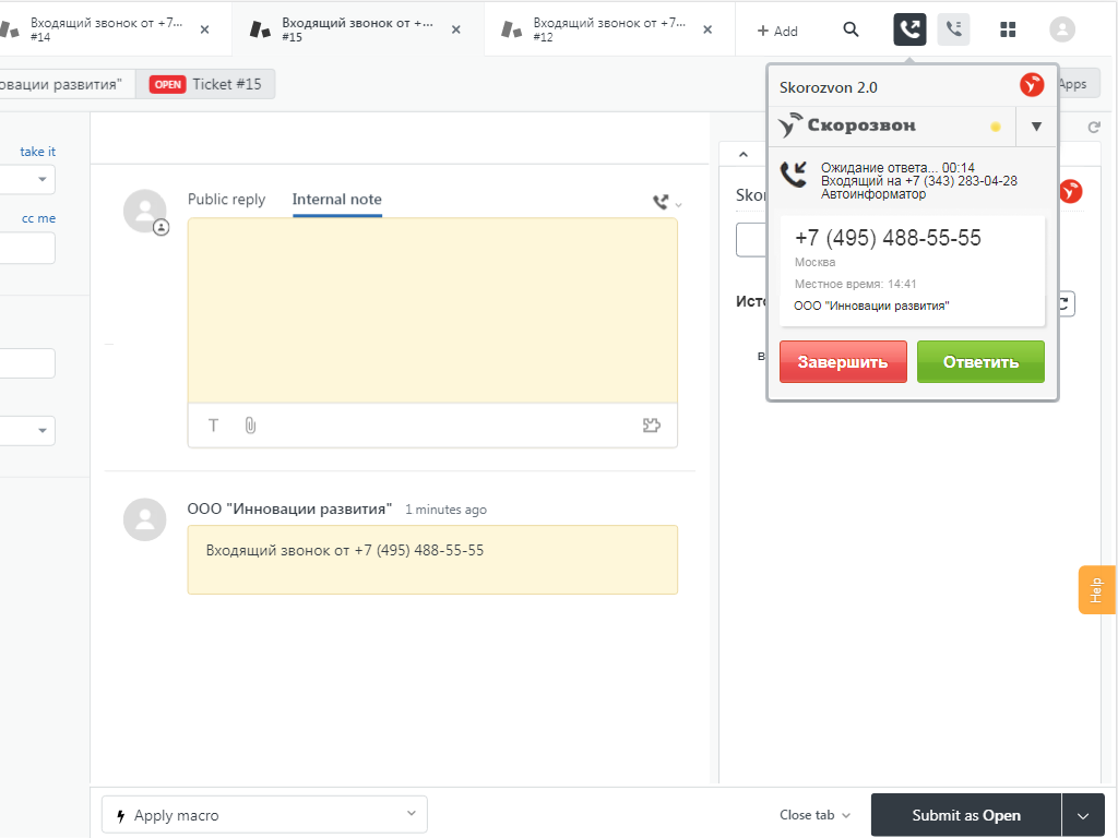 • Автоматически создается тикет “Входящий звонок от <номер клиента>”, куда сотрудник заносит информацию по запросу