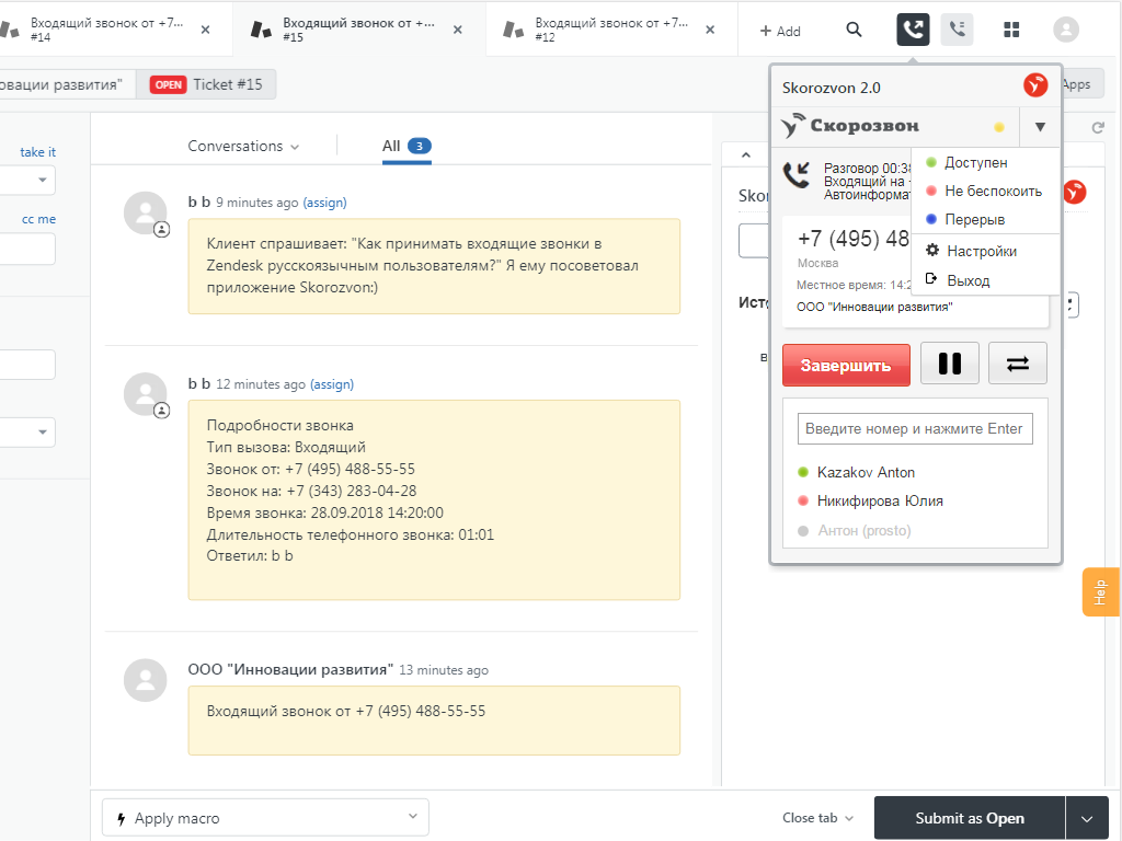 3. Принимайте входящие вызовы в Zendesk, устанавливайте статусы “Доступен” или “Не беспокоить”