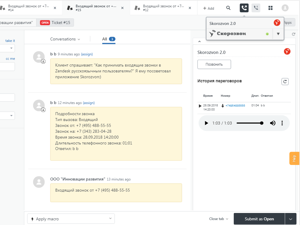 • Позволяет звонить прямо из тикета, если у инициатора запроса указан номер телефона. Для совершения звонка достаточно нажать кнопку ”Позвонить”. Вызов осуществляется через интернет из сервиса Zendesk, поэтому для разговора необходимо использовать гарнитуру