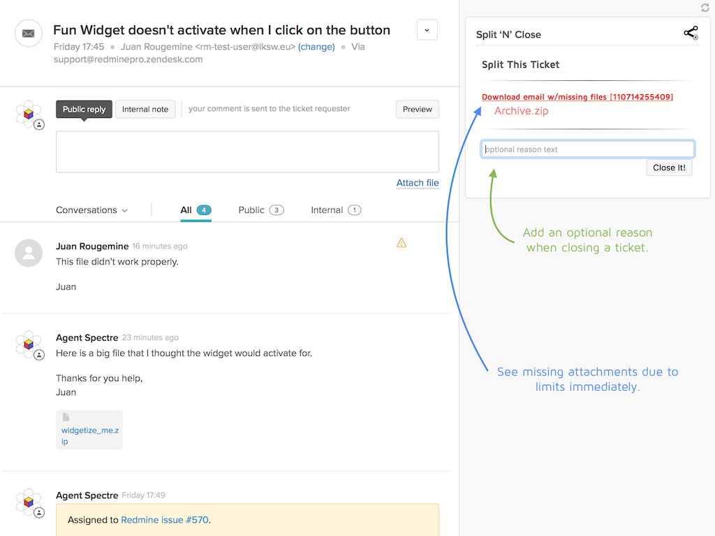 Split ‘n’ Close — let's you split a ticket off into a new one, when the content has become a separate issue. In addition, it allows you to explicitly close a ticket, with an explanation of why. A last feature is that it shows you quite clearly when an attached file is too big and is not being displayed and lets you download the original email with a single click.