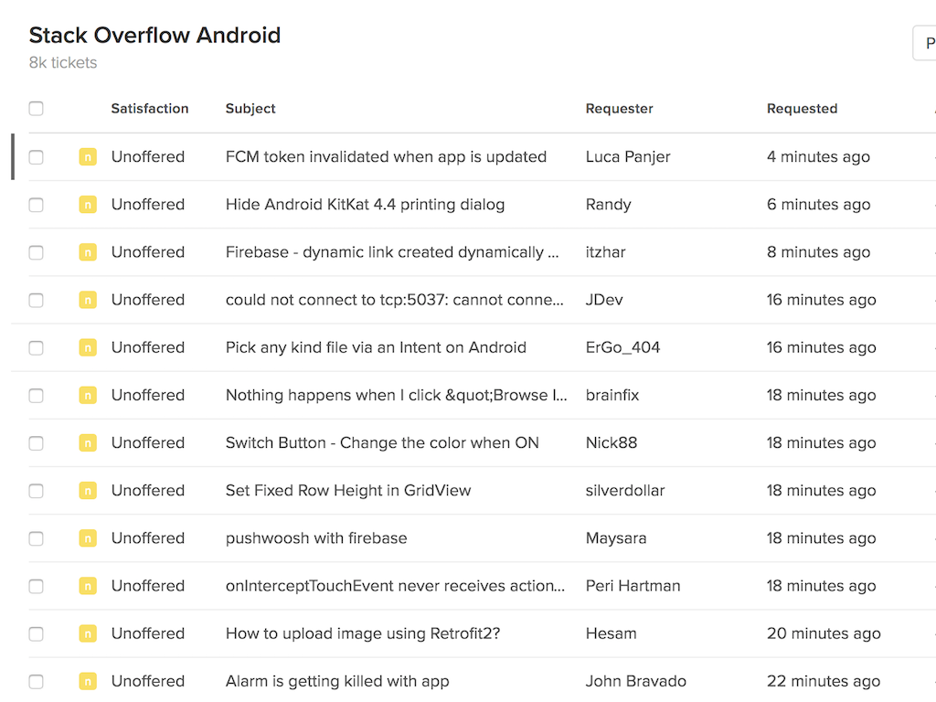 Integrate questions from any Stack Exchange website (such as Stack Overflow or Server Fault) by tag into your Zendesk turning them into tickets. Then simply address them taking advantage of Zendesk's views, macros, and triggers.