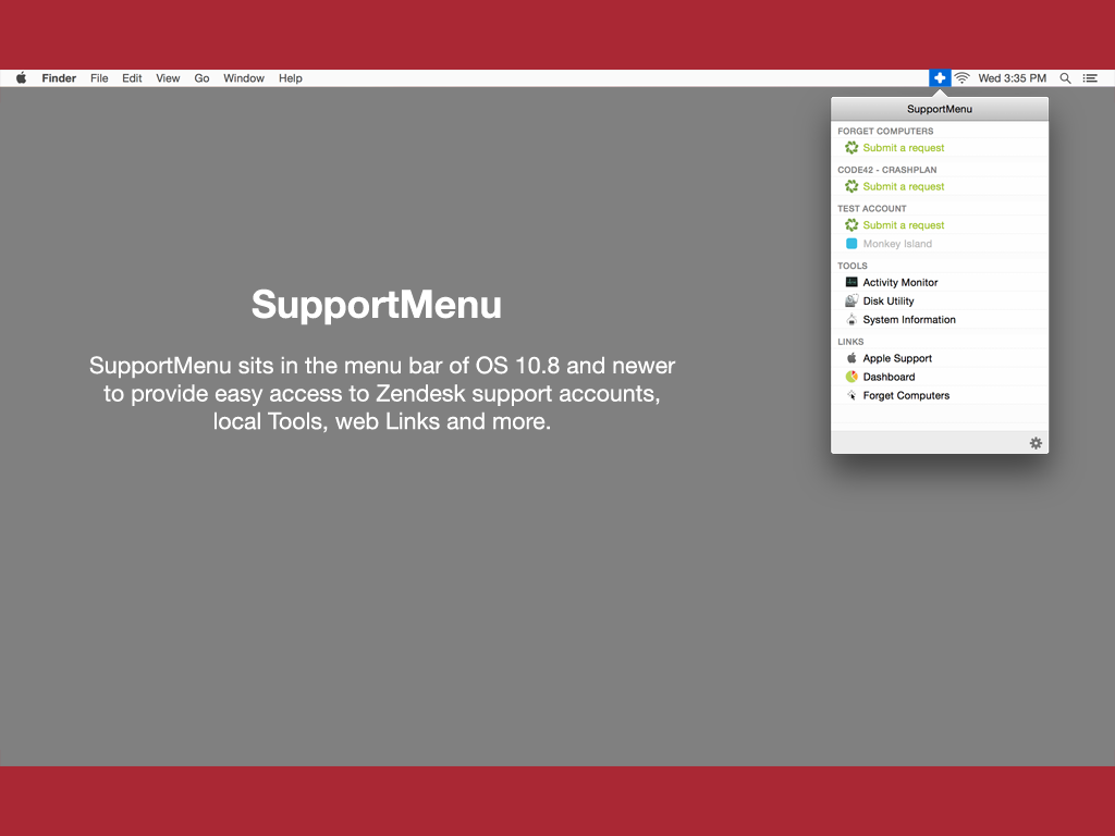 SupportMenu is a Zendesk client app that sits in the menu bar of OS 10.8 and newer Macs (including 10.10 Yosemite) to provide quick and easy access to local tools, web links and more.