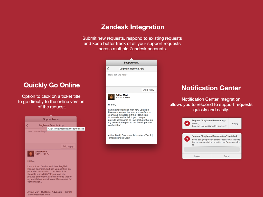 • Respond to and create new Zendesk tickets directly from within SupportMenu.