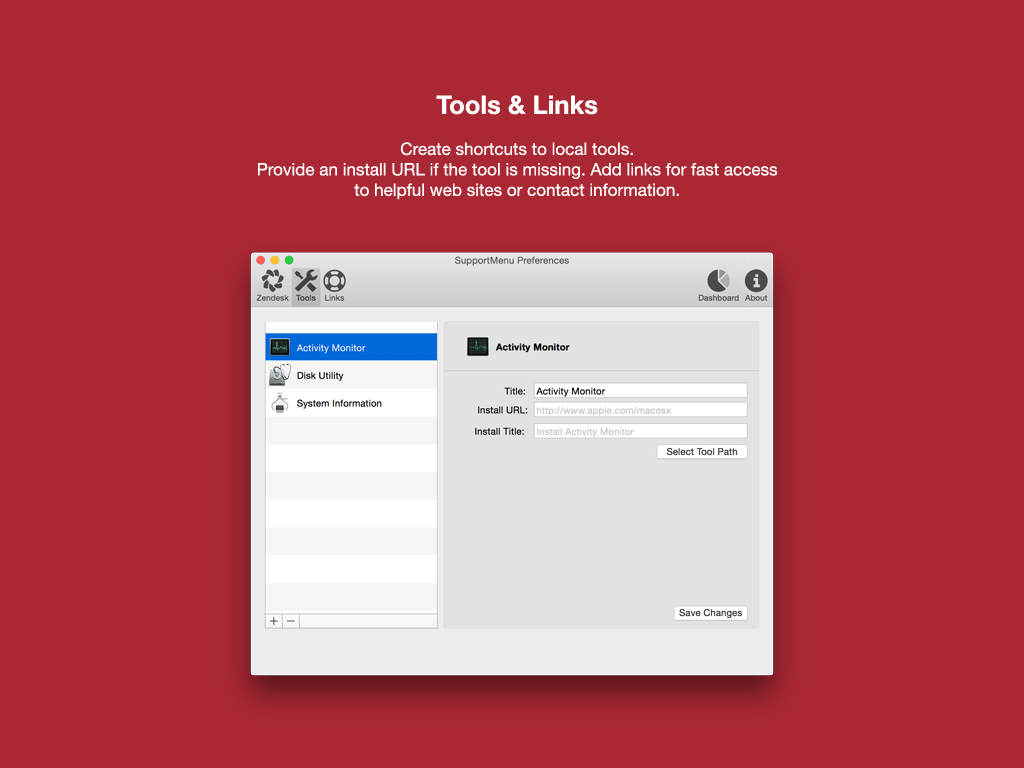 SupportMenu provides a unified, persistent, completely customizable app that integrates your own support tools into one, easy to use menu bar item. SupportMenu also integrates with Zendesk to increase visibility of open queries, raising support requests above the clutter of email. SupportMenu can be customized to consolidate multiple Zendesk ticketing systems, while providing a simple, quick-access button to various support resources.