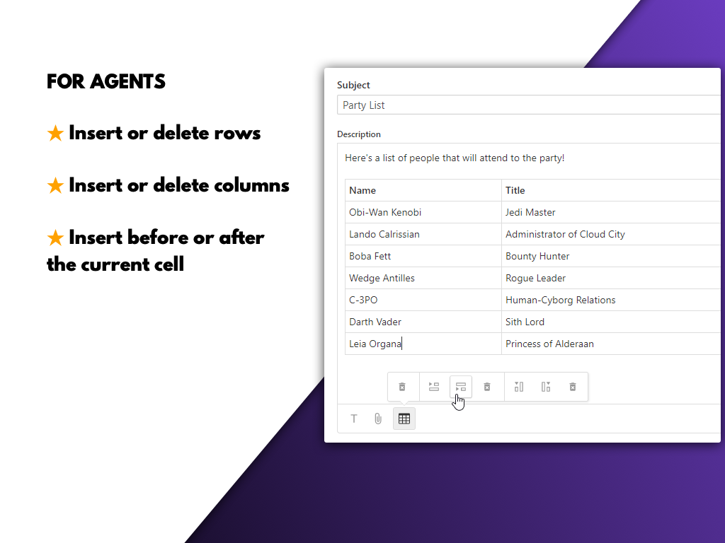 Add tables to your messages in an easy way. Just click the table icon in the editor and select how many rows and columns you want your table to have.