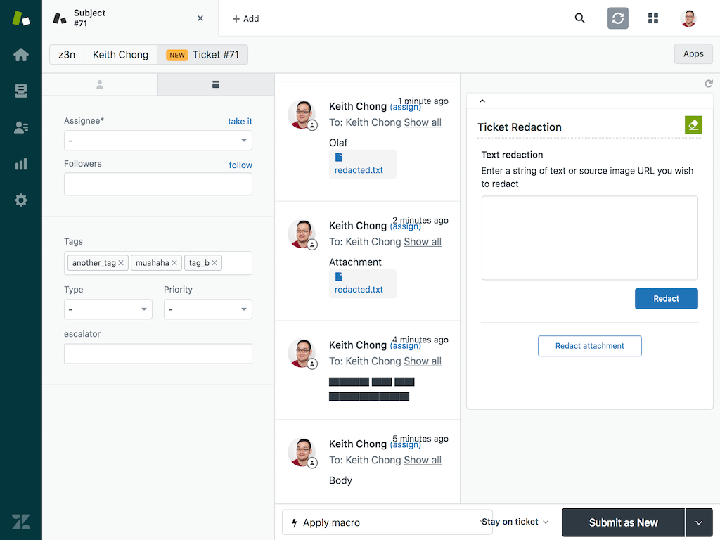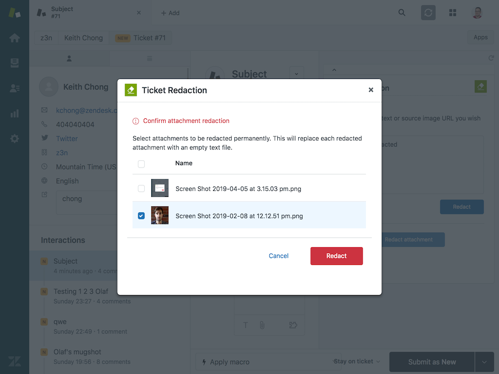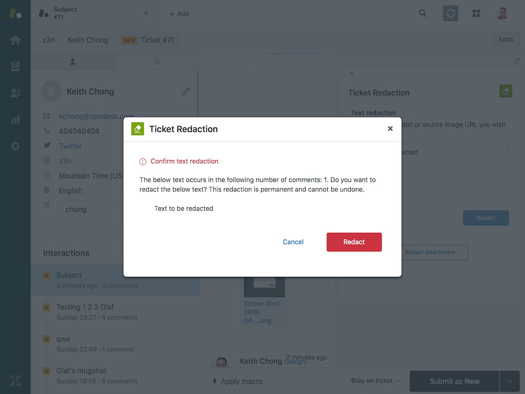 An app for redacting portions of text or attachments from Zendesk Support tickets
