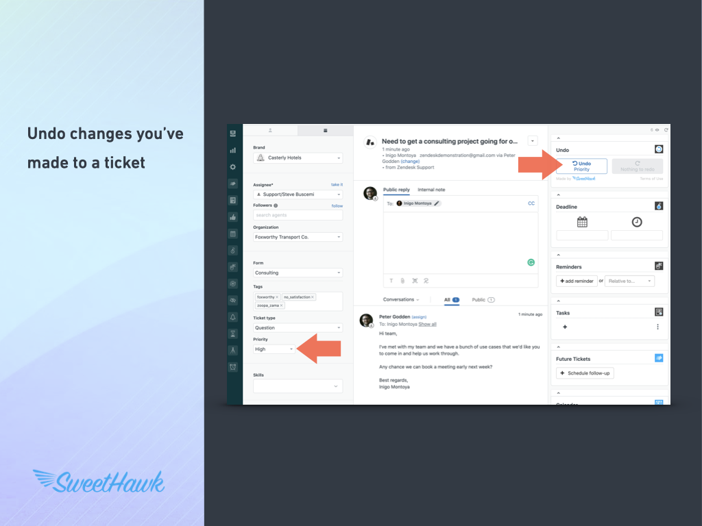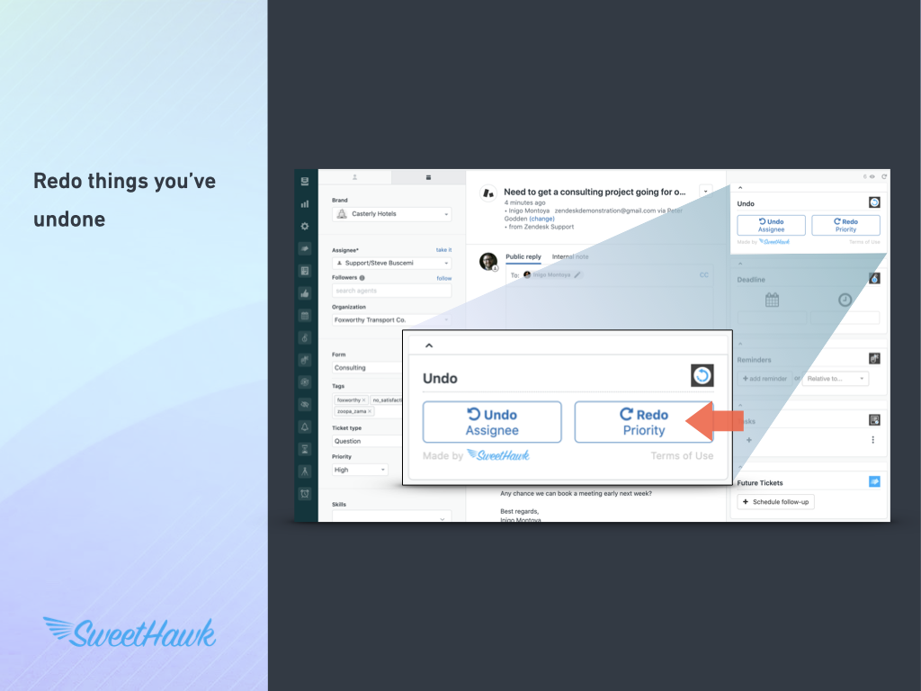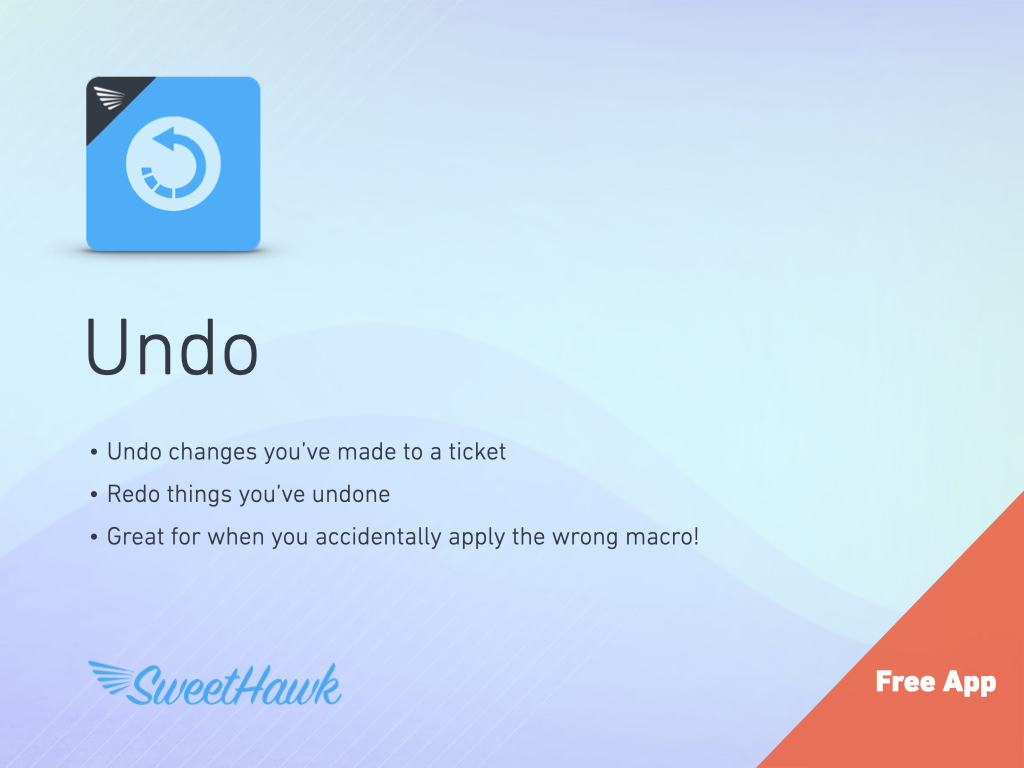 Marketplace App directory Partner Directory Guide Themes Undo Undo and redo live changes on a ticket form (173) Install Description How to install Built by SweetHawk. For information on how to use the app, see our knowledge base article and video here. App Details Author: SweetHawk Price: Free Support: Email / Website Version:2.5 This is an app. It will install right into your Zendesk Support account. reviews Sign in to review .zendesk.com Sign in to review Get your app in The Marketplace Find out what it takes to get your app on the digital shelves. Learn more