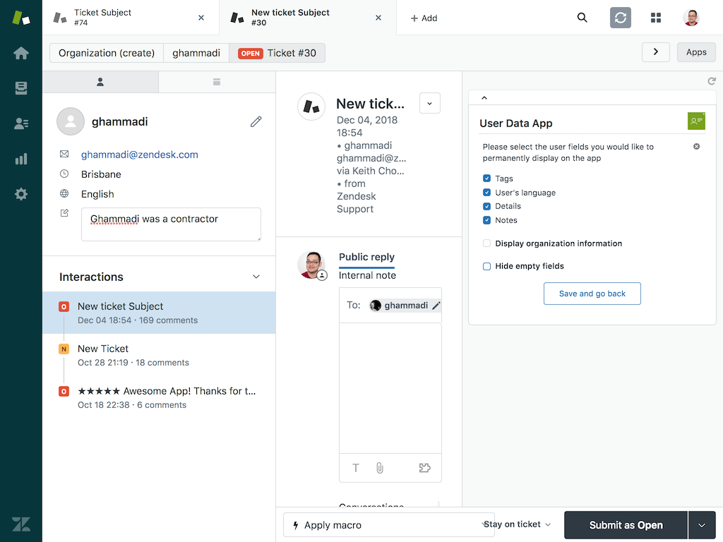 The Zendesk Support User Data app gives you customer information, including user and organization details such as tags, ticket activity, and contact, right next to a ticket.