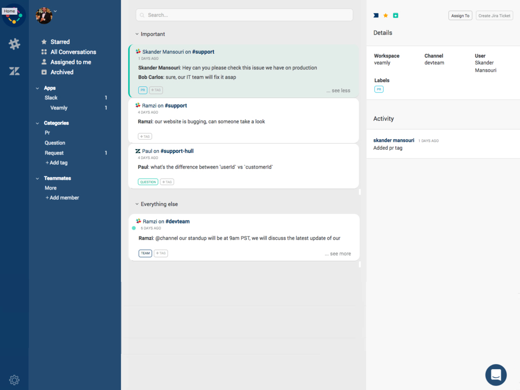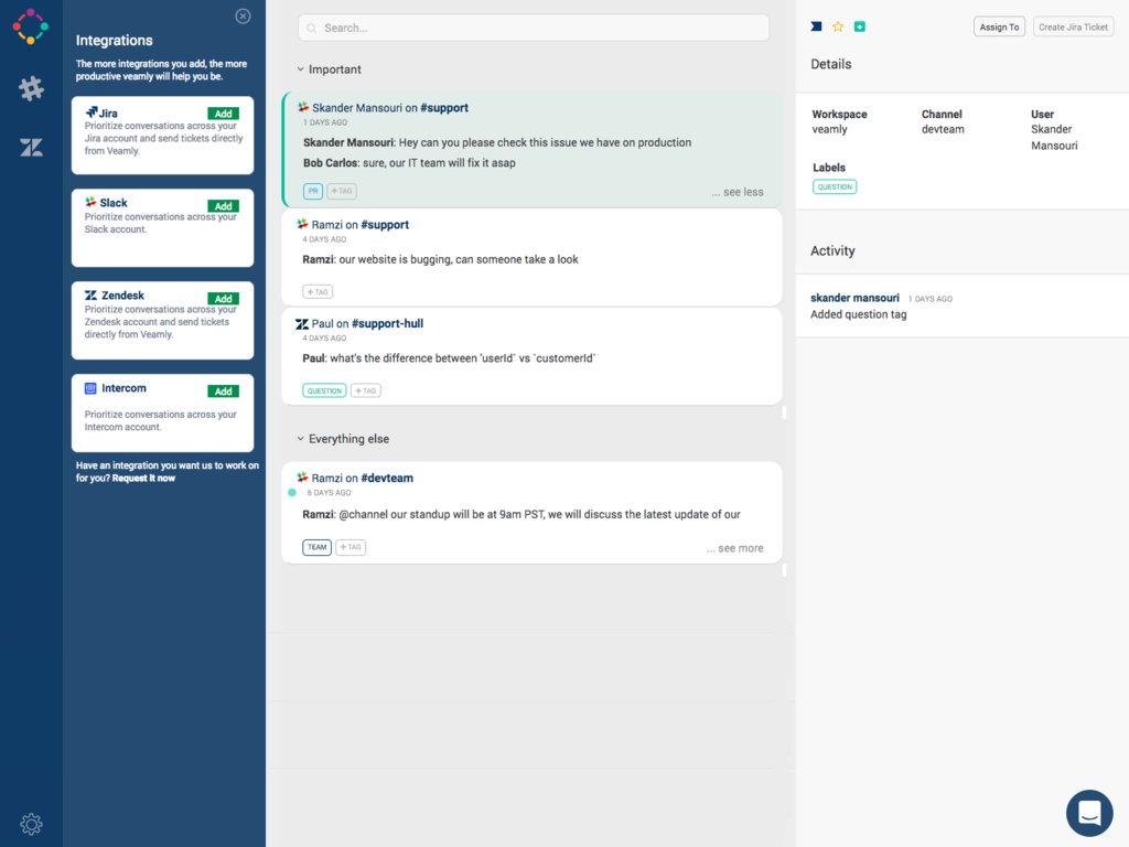 By bringing Zendesk along with the rest of your apps in one place, Veamly allows you to easily focus on the work you need to be doing and minimizes the jump and forth between different systems. With its unified feed, it gives you a quick overview of what's going on while allowing to do fast interactions like process Zendesk tickets , create Jira tickets and more.