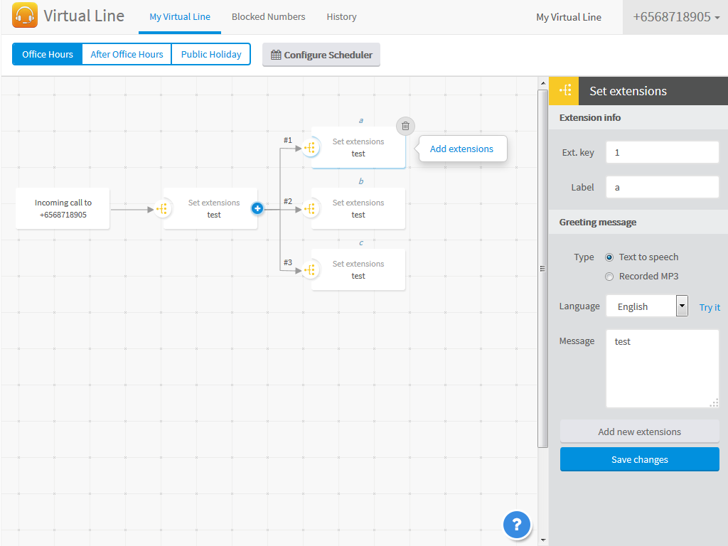 Virtual Line is one of the easiest and most powerful tools to create telephony solutions over the Internet, wherever you are. By adopting the block design, we make it easier for everyone to set up telephony systems without the need for IT support. Now you can sound professional by greeting customers with personalised messages, and manage service requests efficiently over an interactive voice response (IVR) menu with our text-to-speech software - all at a fraction of the cost of traditional phone systems.