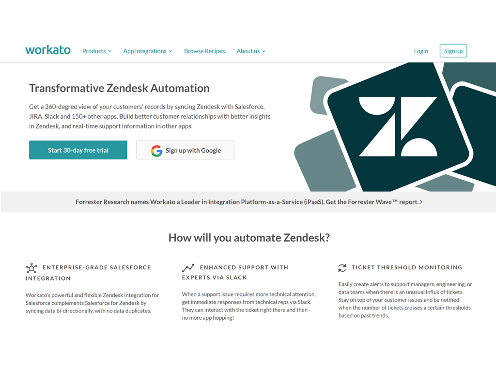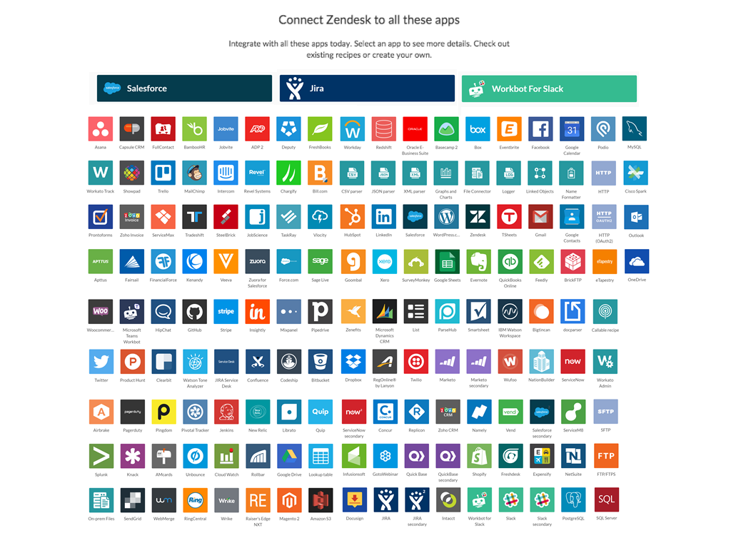 Workato, an iPaaS leader trusted by over 21,000 organizations, is the only platform for intelligent automations for Zendesk with 200+ other business apps including JIRA, Slack, Microsoft Teams and more.