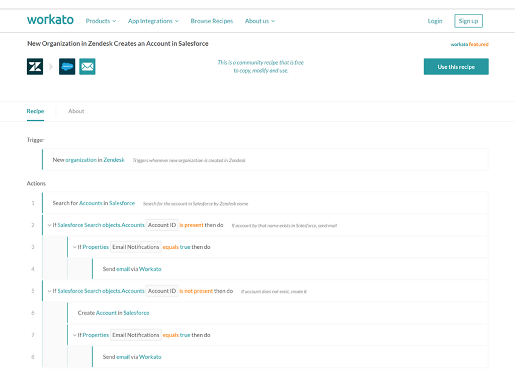 Join over 21,000 businesses to integrate your apps with Workato. Simply select and run any of over 20,000 community integrations created by experts. Or, create custom integrations yourself without needing an IT team.