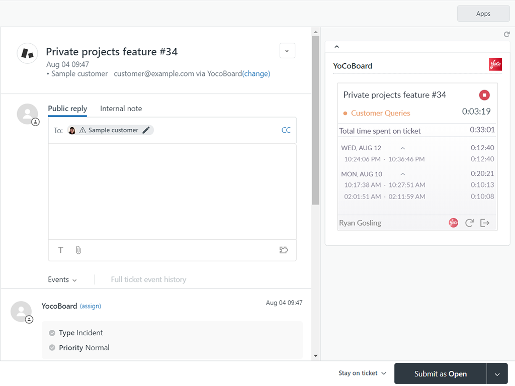 The YoCoBoard-Zendesk integration app empowers you to track and monitor the amount of time you spend on a ticket. This app helps you: 1. Clock in and record the time spent on individual tickets in your dashboard. 2. View tracked hours of a ticket right from Zendesk. 3. Seamlessly sync ticket-based time with the overall project time. 4. Automatically fetch ticket details when a ticket is opened. 5. Get ticket-based breakdown of productivity in the dashboard of your web app.