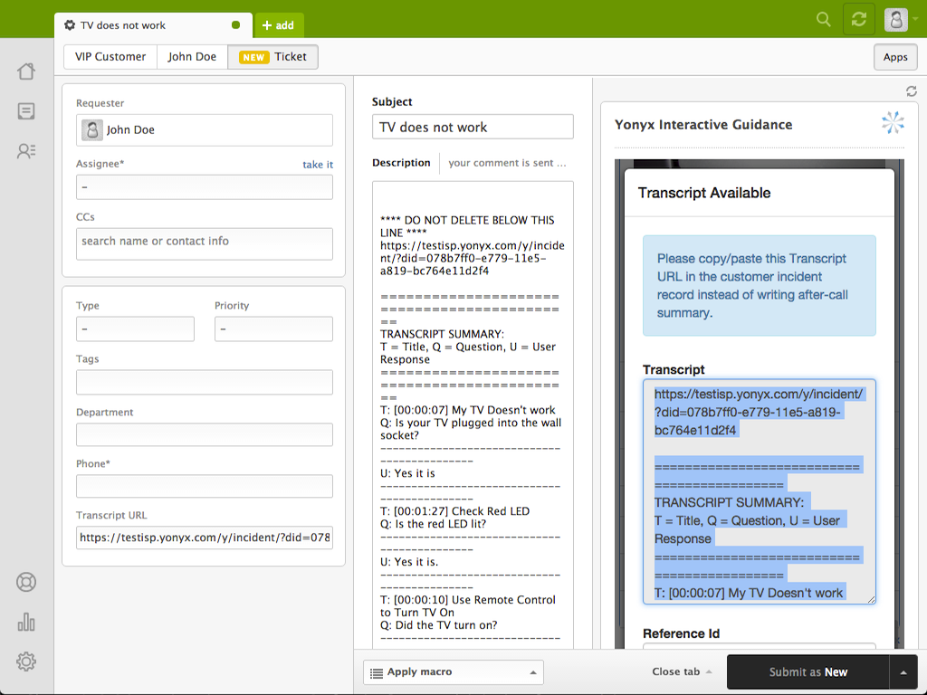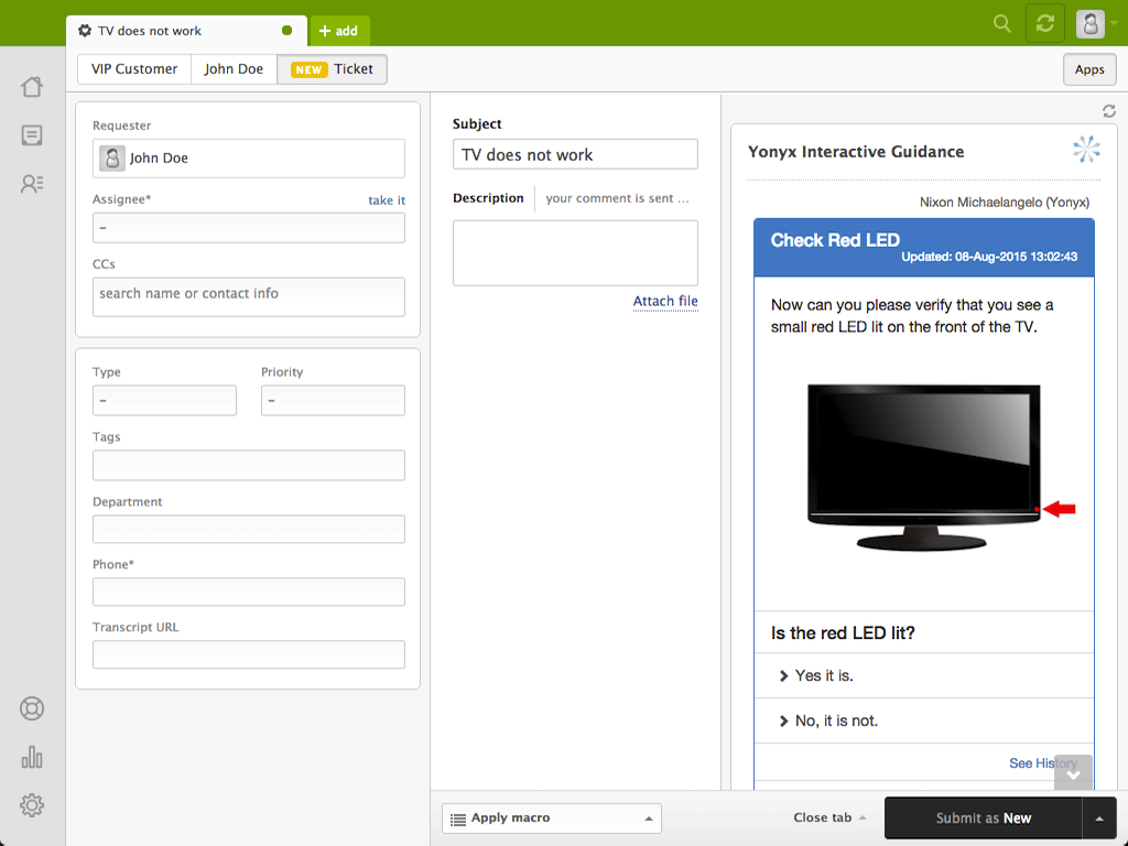 Using the Yonyx cloud based platform, you can create decision tree driven interactive guides. These guides can be published for interactive self service for your customers or for guiding your call center agents. In either application, Yonyx guides are used integrated with Zendesk.