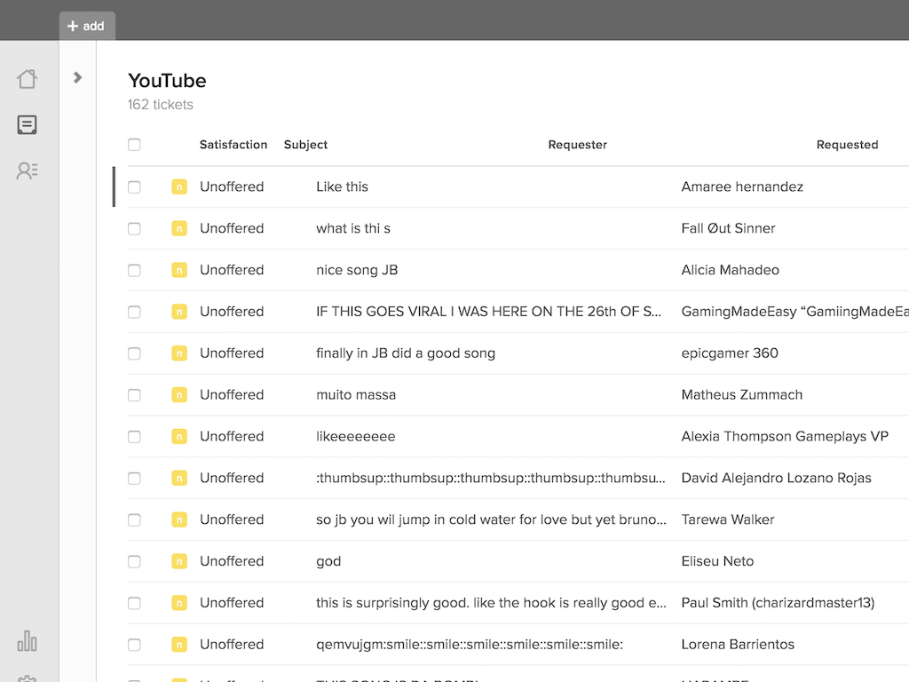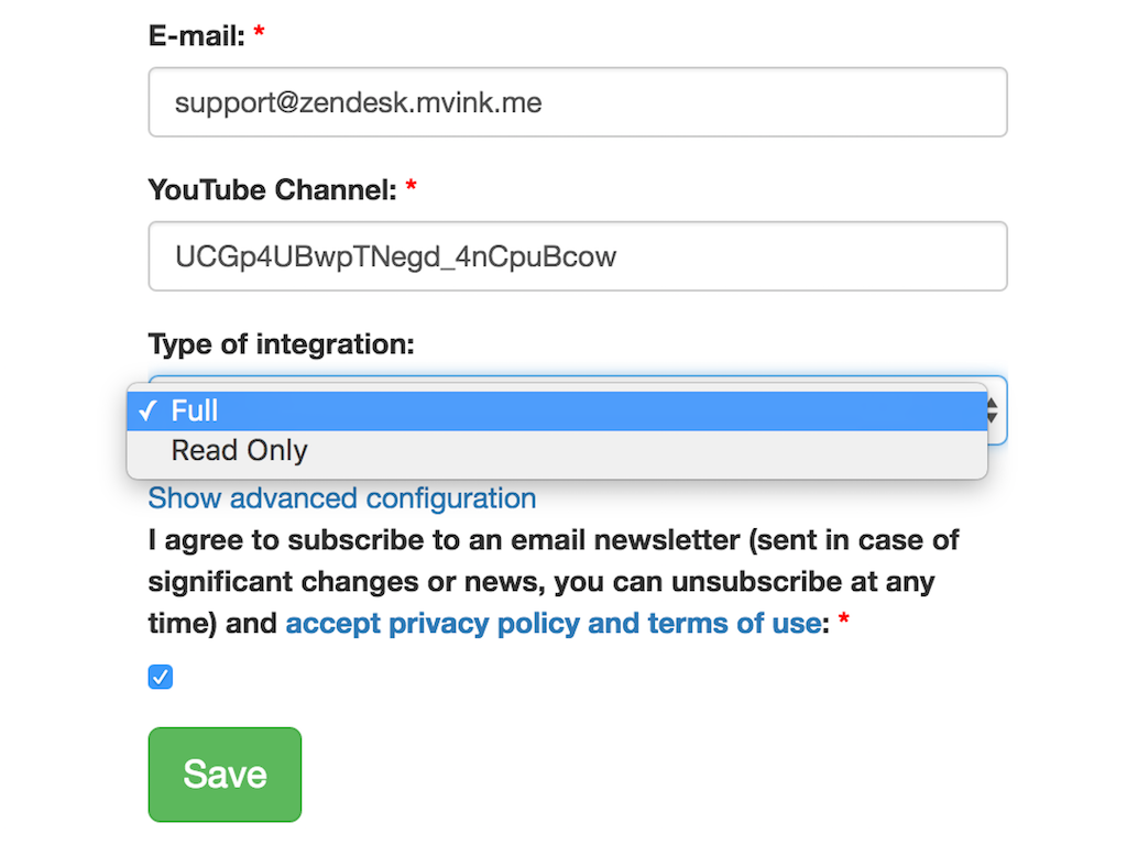 Features: * All Channel's Videos Comments: This integration creates tickets for all YouTube channel comments and all comments of videos added under the channel. * Clickthrough support: Links to YouTube comment to be viewed on YouTube are added to every ticket created by the integration. * Channelback support: Answers from Zendesk are automatically replicated in YouTube as comments from your name (option to be selected in the settings). * Up to 100 tickets every 2 minutes: Integration is capable of turning 100 YouTube comments into tickets every 2 minutes (per configured channel). * Multiple channels supported: You can enable this integration to work with up to 25 YouTube channels at a time (can be increased in the future). * Easy installation: Just install the application from Zendesk Marketplace to your instance, add contact information and channel - that's it!