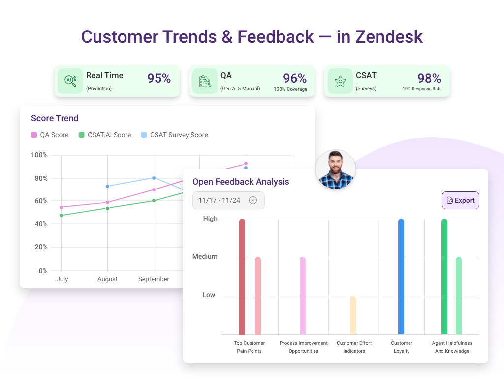 CSAT.AI analyzes 100% of Zendesk Support conversations (chat, email, voice), scores them against your brand’s communication DNA, and links results to KPIs & ROI. Generative AI is built in for custom metrics and summaries.